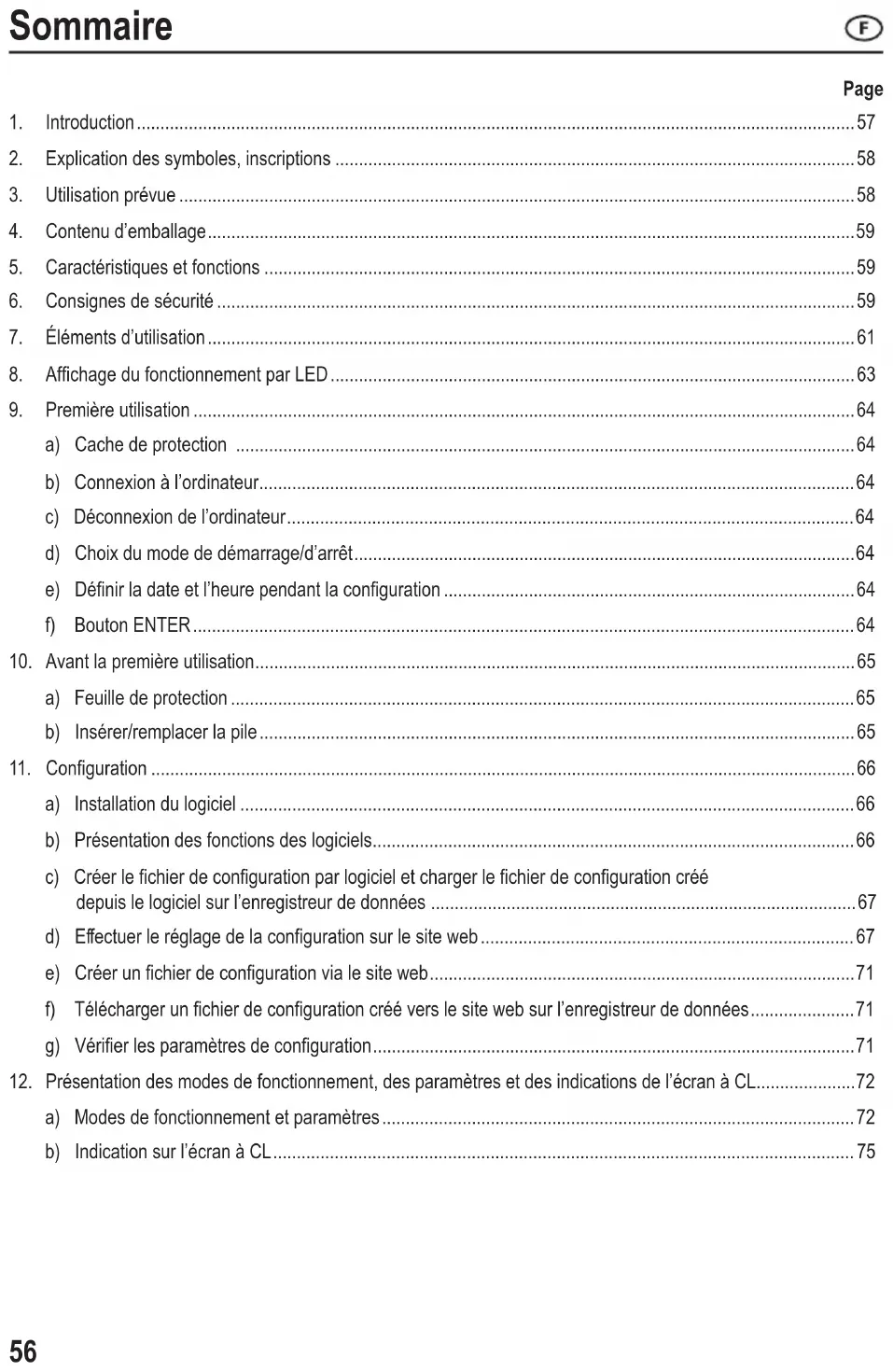 paramètres et des indications de l’écran à CL a) Modes de fonctionnement et paramètres Pourdénirlesparamètresdecongurationsuivants,reportez-vousauxoptions«Effectuerleréglagedelaconguration surlesiteweb»onpage67. Mode 1 Fonction L'enregistrementcommenceimmédiatement. L'enregistrements'arrêtelorsquelamémoireestpleine. Réglage Sélectionnez «IMMÉDIATEMENTJUSQU'ÀMÉMOIREPLEINE»comme«ENREG.CONDITION DEDÉBUT». Mode 2 Fonction L'enregistrementcommenceimmédiatement. L'enregistrements'arrêtelorsqueleboutonENTER (7) est maintenu enfoncé pendant quelques secondes. Réglage Sélectionnez «IMMÉDIATEMENTJUSQU'ÀMÉMOIREPLEINE»comme«ENREG.CONDITION DEDÉBUT». (Sélectionnez«BOUTOND'ARRÊT»comme«STYLED'ARRÊT»lorsdelaconguration.) Mode 3 Fonction L'enregistrementcommenceimmédiatement. L'enregistrements'arrêteaprèslacréationdurapportPDF. Réglage Sélectionnez «IMMÉDIATEMENTJUSQU'ÀMÉMOIREPLEINE»comme«ENREG.CONDITION DEDÉBUT». Sélectionnez«APRÈSPDFCRÉÉ»comme«STYLED'ARRÊT». Mode 4 Fonction L'enregistrementcommencelorsqueleboutonENTER (7) est maintenu enfoncé pendant quelques secondes. L'enregistrements'arrêtelorsquelamémoireestpleine. Réglage Sélectionnez «DÉMARRAGEENAPPUYANTSURTOUCHE»comme«ENREG.CONDITIONDE DÉBUT». Mode 5 Fonction L'enregistrementcommenceets'arrêtelorsqueleboutonENTER (7) est maintenu enfoncé pendant quelques secondes. Réglage Sélectionnez «DÉMARRAGEENAPPUYANTSURTOUCHE»comme«ENREG.CONDITIONDE DÉBUT». (Sélectionnez«BOUTOND'ARRÊT»comme«STYLED'ARRÊT»lorsdelaconguration.)73 Mode 6 Fonction L'enregistrementcommencelorsqueleboutonENTER (7) est maintenu enfoncé pendant quelques secondes. L'enregistrements'arrêteaprèslacréationdurapportPDF. Réglage Sélectionnez «DÉMARRAGEENAPPUYANTSURTOUCHE»comme«ENREG.CONDITIONDE DÉBUT». Sélectionnez«APRÈSPDFCRÉÉ»comme«STYLED'ARRÊT». Mode 7 Fonction L'enregistrementcommenceàl'heuredénie. L'enregistrements'arrêtelorsquelamémoireestpleine. Réglage Sélectionnez «DÉMARRAGESURL'HEUREDEDÉBUT»comme«ENREG.CONDITIONDE DÉBUT». Dénissezladateetl'heurededébutd'enregistrementdanslechamp«HEUREDEDÉBUT». Mode 8 Fonction L'enregistrementcommenceàl'heuredénie. L'enregistrements'arrêtelorsqueleboutonENTER (7) est maintenu enfoncé pendant quelques secondes. Réglage Sélectionnez «DÉMARRAGESURL'HEUREDEDÉBUT»comme«ENREG.CONDITIONDE DÉBUT». Définissezladateetl'heurededébutd'enregistrementdanslechamp«HEUREDEDÉBUT». (Sélectionnez«BOUTOND'ARRÊT»comme«STYLED'ARRÊT»lorsdelaconguration.) Mode 9 Fonction L'enregistrementcommenceàl'heuredénie. L'enregistrements'arrêteaprèslacréationdurapportPDF. Réglage Sélectionnez «DÉMARRAGESURL'HEUREDEDÉBUT»comme«ENREG.CONDITIONDE DÉBUT». Définissezladateetl'heurededébutd'enregistrementdanslechamp«HEUREDEDÉBUT». Sélectionnez«APRÈSPDFCRÉÉ»comme«STYLED'ARRÊT». Mode 10 Fonction L'enregistrementcommenceets'arrêteàl'heuredénie. Réglage Sélectionnez «HEUREDÉBUT/ARRÊT»comme«ENREG.CONDITIONDEDÉBUT». Dénissezladateetl'heurededébutd'enregistrementdanslechamp«HEUREDEDÉBUT». Dénissezladateetl'heured'arrêtd'enregistrementdanslechamp«HEURED'ARRÊT».74 Mode 11 Fonction Enregistre les données immédiatement et en boucle. L'enregistrements'arrêtelorsquelapileestdéchargéeouque«LOGGINGENBOUCLE»aété remplacéparuneautre«ENREG.CONDITIONDEDÉBUT»pendantlaconguration. Réglage Sélectionnez « LOGGINGENBOUCLE»comme«ENREG.CONDITIONDEDÉBUT». Mode 12 Fonction Enregistre les données immédiatement et en boucle. Sivoussouhaitezunmoded’arrêtsupplémentaire,sélectionnez: L'enregistrements'arrêtelorsqueleboutonENTER (7) est maintenu enfoncé pendant quelques secondes. Réglage Sélectionnez « LOGGINGENBOUCLE»comme«ENREG.CONDITIONDEDÉBUT». (Sélectionnez«BOUTOND'ARRÊT»comme«STYLED'ARRÊT»lorsdelaconguration.) Mode 13 Fonction Enregistre les données immédiatement et en boucle. Sivoussouhaitezunmoded’arrêtsupplémentaire,sélectionnez: L'enregistrements'arrêteaprèslacréationdurapportPDF. Réglage Sélectionnez « LOGGINGENBOUCLE»comme«ENREG.CONDITIONDEDÉBUT». Sélectionnez«APRÈSPDFCRÉÉ»comme«STYLED'ARRÊT».