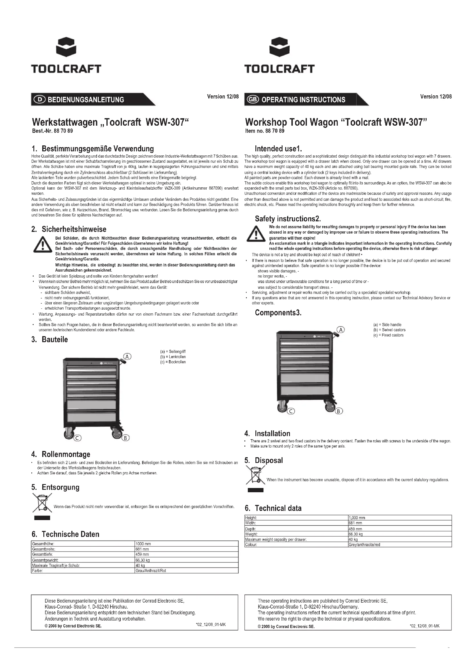 (a) = Seitengriff(b) = Lenkrollen(c) = Bockrollen Rollenmontage4. Es befinden sich 2 Lenk- und zwei Bockrollen im Lieferumfang. Befestigen Sie die Rollen, indem Sie sie mit Schrauben an • der Unterseite des Werkstattwagens festschrauben. Achten Sie darauf, dass Sie jeweils 2 gleiche Rollen pro Achse montieren.• Entsorgung5. Wenn das Produkt nicht mehr verwendbar ist, entsorgen Sie es entsprechend den gesetzlichen Vorschriften. Technische Daten6. Gesamthöhe: 1000 mmGesamtbreite: 681 mmGesamttiefe: 459 mmGesamtgewicht: 66,30 kgMaximale Tragkraft je Schub: 40 kgFarbe: Grau/Anthrazit/RotThese operating instructions are published by Conrad Electronic SE,Klaus-Conrad-Straße 1, D-92240 Hirschau/Germany.The operating instructions reflect the current technical specifications at time of print. We reserve the right to change the technical or physical specifications.© 2008 by Conrad Electronic SE.*02_12/08_01-MKDiese Bedienungsanleitung ist eine Publikation der Conrad Electronic SE,Klaus-Conrad- Straße 1, D-92240 Hirschau.Diese Bedienungsanleitung entspricht dem technischen Stand bei Drucklegung.Änderungen in Technik und Ausstattung vorbehalten.© 2008 by Conrad Electronic SE.*02_12/08_01-MKMODE D’EMPLOI Version 12/08 Servante d’atelier pour outils « Toolcraft WSW-307 » Nº de commande 88 70 89 Utilisation prévue1. De haute qualité avec une finition parfaite et un design industriel, cette servante pour ateliers industriels est caractérisée par ses 7 tiroirs. La servante d’atelier est équipée d’un système d’arrêt des tiroirs permettant de maintenir et de n’ouvrir qu’un seul tiroir à la fois. Chaque tiroir a une capacité de charge maximale de 40 kg, glissant sur un roulement à billes et rails de guidage et ferme à clé au moyen d’un cylindre central verrouillable (2 clés livrés).Toutes les parties sont pulvérisées d’un revêtement par poudre. Chaque tiroir est garni d’un tapis isolant. De par ces couleurs décentes, cette servante d’atelier s’intègre dans n’importe quel environnement. En option, le Toolcraft SW- 307 peut être étendu en y ajoutant un coffre à outils et pour petits matériels du type WZK-309 (numéro d’article 887090). La conversion et/ou la modification non autorisées de l’appareil ne sont pas permises pour des raisons de sécurité et d’approbation. Tout usage autre que celui décrit ci-dessus est interdit, peut endommager le produit et poser des risques tels que courts-circuits, incendies, chocs électriques, etc. Prière de lire attentivement le mode d’emploi et de le conserver à titre de référence. Consignes de sécurité2. Nous déclinons toute responsabilité en cas de dommages matériels ou de blessures dans le cas où cet appareil aurait été maltraité de quelque façon que ce soit ou endommagé du fait d’une mauvaise utilisation ou d’un non respect de ce mode d’emploi. La garantie en serait d’ailleurs annulée!Le point d’exclamation attire l’attention sur une information importante dont il convient de tenir compte impérativement. Les transformations et/ou modifications de cet appareil sont inacceptables pour des raisons de sécurité et de respect des • normes.Ce produit n’est pas un jouet et doit être tenu hors de portée des enfants! •Il faut considérer que l’appareil ne peut plus fonctionner sans danger lorsqu’il : •présente des dommages visibles, -ne marche plus, -a été entreposé pendant une longue durée dans des conditions non appropriées ou -présente de fortes sollicitations de transport. - L’entretien, les réglages et les réparations doivent être effectuées par un spécialiste ou un atelier spécialisé. • Si vous avez des questions sur des sujets non abordés dans ce mode d’emploi, contactez notre service technique ou • autres experts. Composants3.
