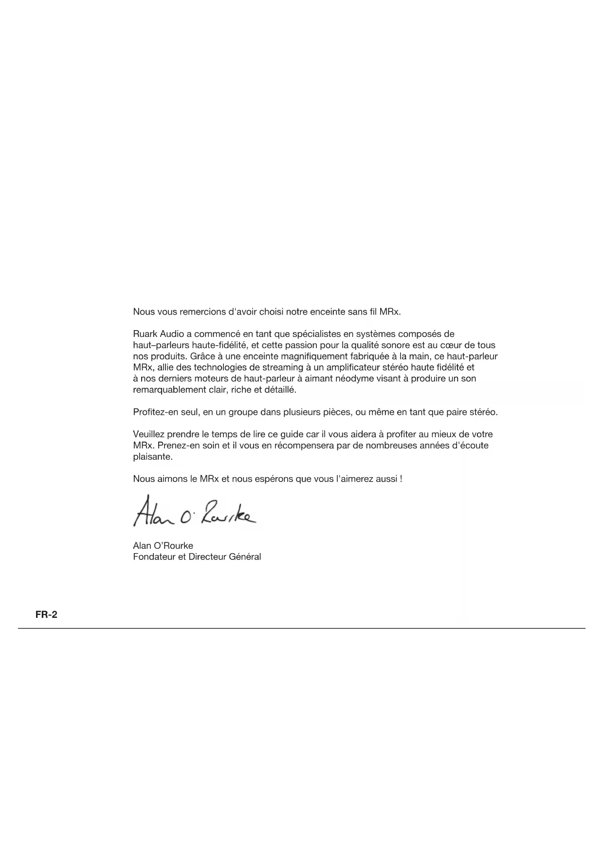 Haut-parleur sans fil MRxFR-2 Nous vous remercions d'avoir choisi notre enceinte sans l MRx. Ruark Audio a commencé en tant que spécialistes en systèmes composés de haut–parleurs haute-délité, et cette passion pour la qualité sonore est au cœur de tous nos produits. Grâce à une enceinte magniquement fabriquée à la main, ce haut-parleur MRx, allie des technologies de streaming à un amplicateur stéréo haute délité et à nos derniers moteurs de haut-parleur à aimant néodyme visant à produire un son remarquablement clair, riche et détaillé. Protez-en seul, en un groupe dans plusieurs pièces, ou même en tant que paire stéréo. Veuillez prendre le temps de lire ce guide car il vous aidera à proter au mieux de votre MRx. Prenez-en soin et il vous en récompensera par de nombreuses années d'écoute plaisante. Nous aimons le MRx et nous espérons que vous l'aimerez aussi! Alan O’Rourke Fondateur et Directeur GénéralFR-3