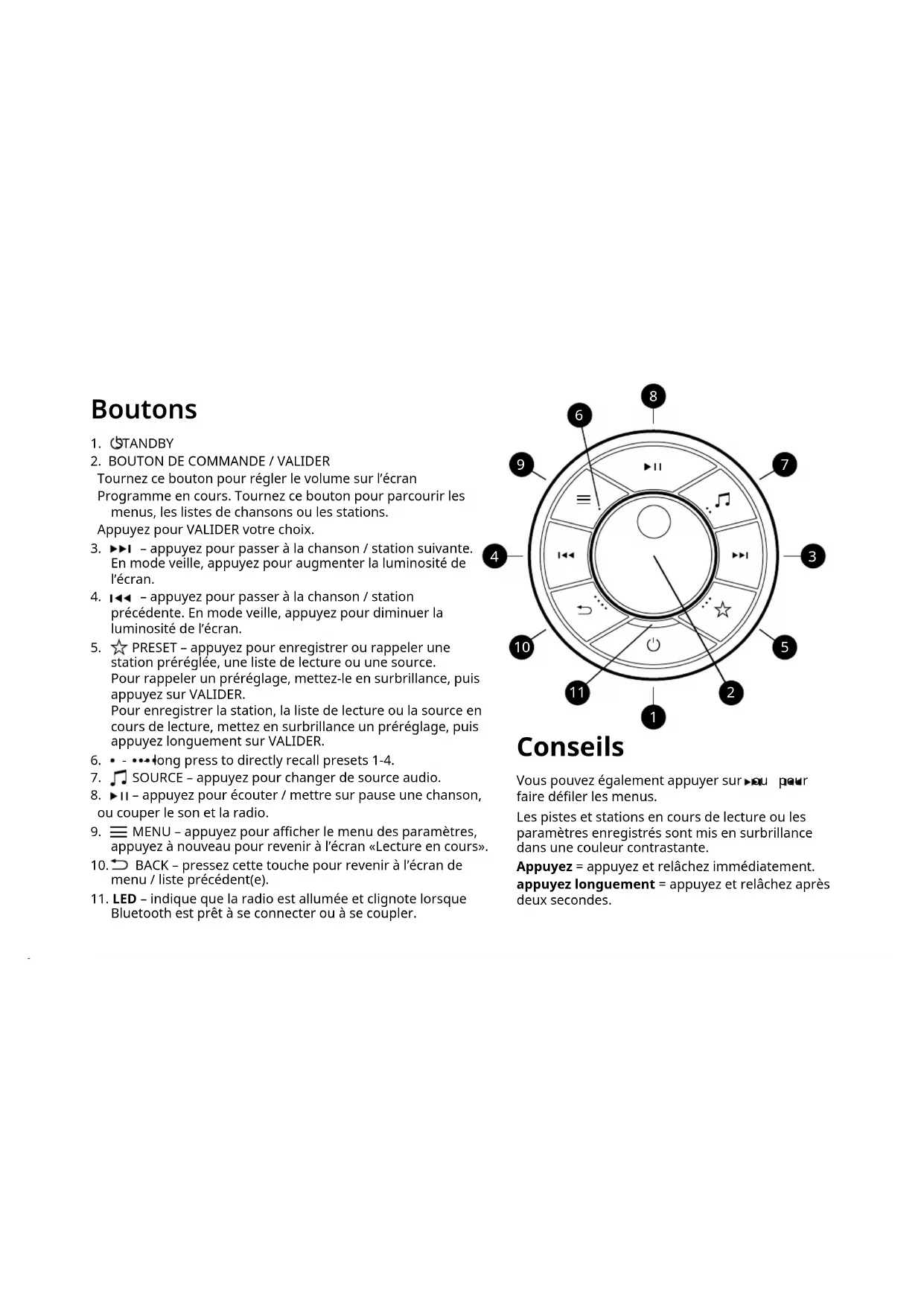 Conseils Vous pouvez également appuyer sur ou pour faire déler les menus. Les pistes et stations en cours de lecture ou les paramètres enregistrés sont mis en surbrillance dans une couleur contrastante. Appuyez = appuyez et relâchez immédiatement. appuyez longuement = appuyez et relâchez après deux secondes.EN