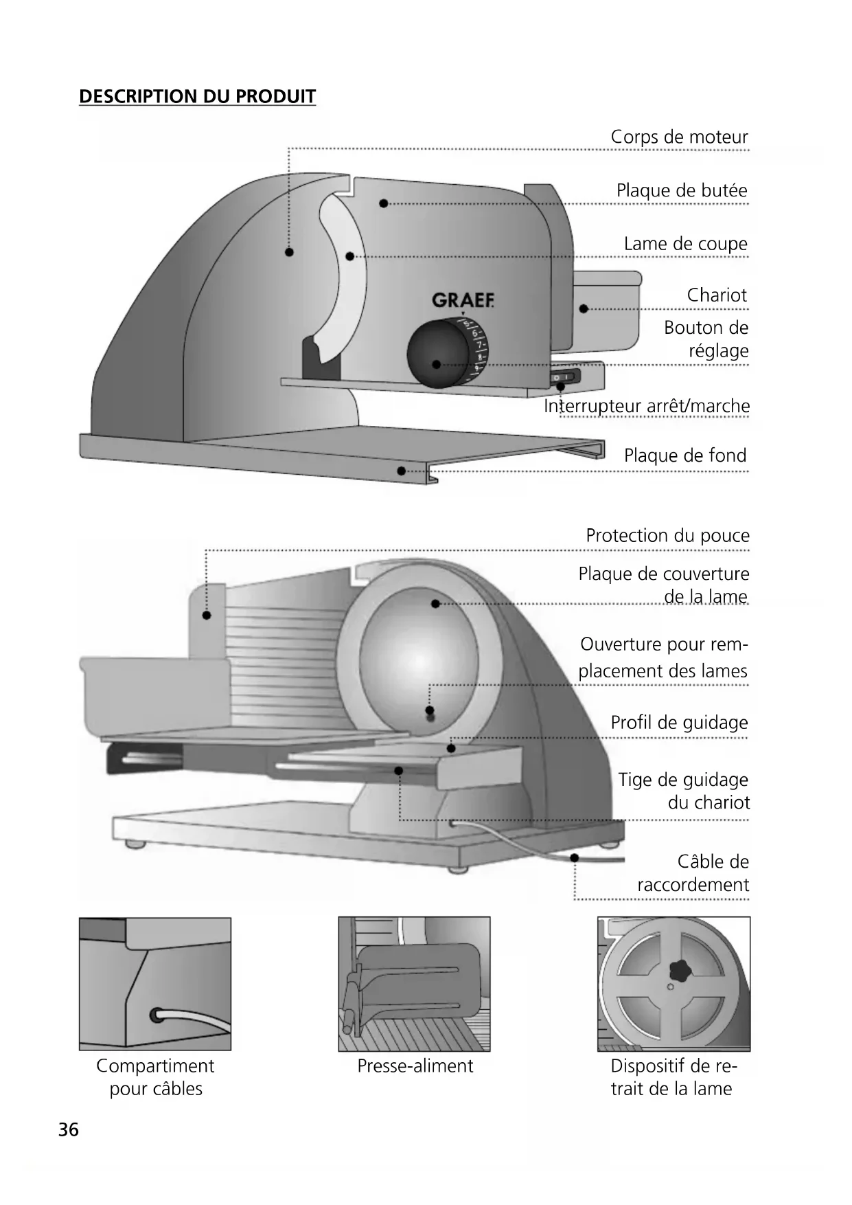Lame de coupe Chariot Interrupteur arrêt/marche Plaque de butée Bouton de réglage Plaque de fond Plaque de couverture de la lame Prol de guidage Ouverture pour rem- placement des lames Tige de guidage du chariot Câble de raccordement Compartiment pour câbles Presse-aliment Corps de moteur Protection du pouce Dispositif de re- trait de la lame37
