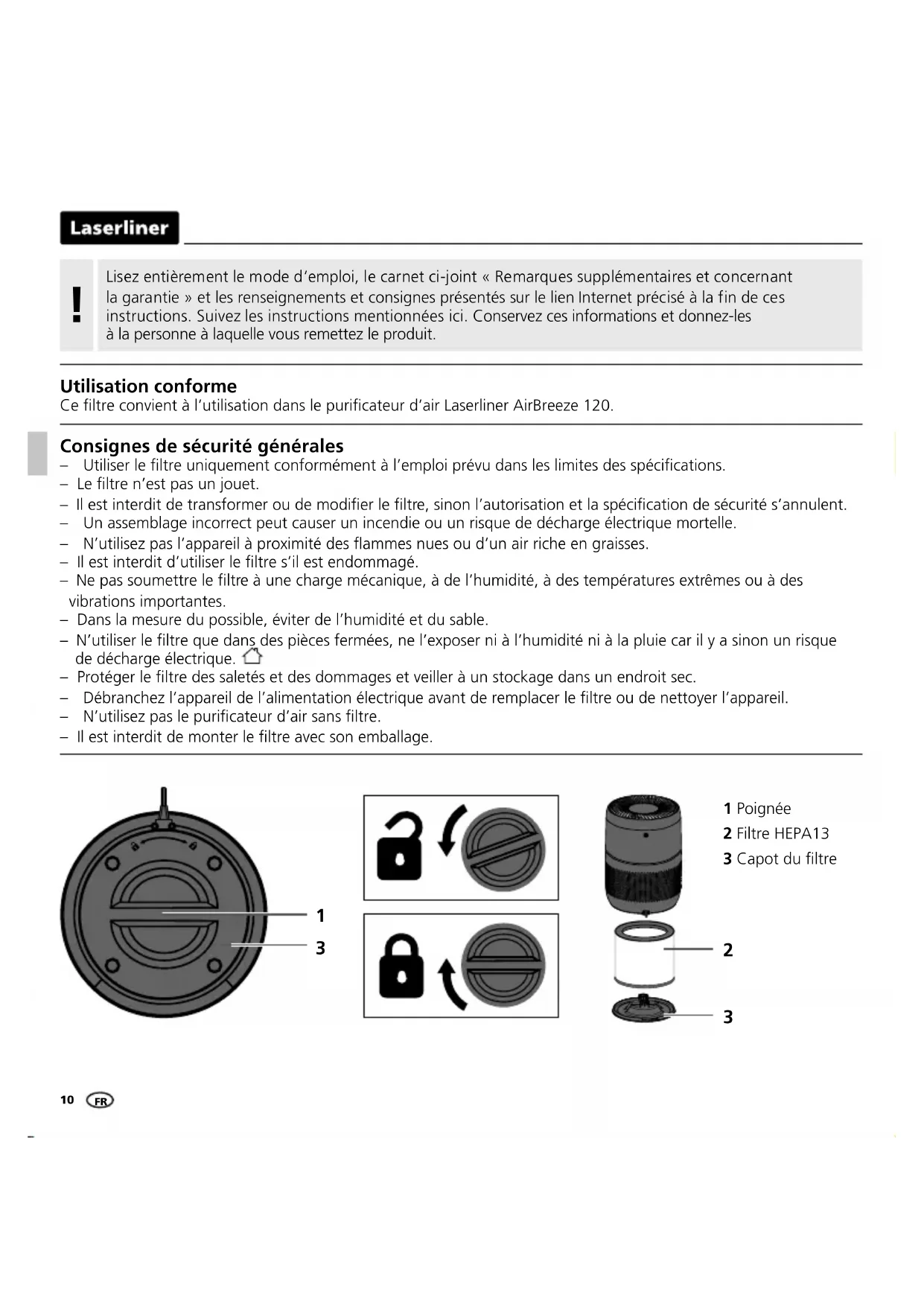 1 Poignée 2 FiltreHEPA13 3 Capotdultre Consignes de sécurité générales – Utiliserleltreuniquementconformémentàl’emploiprévudansleslimitesdesspécications. –Leltren’estpasunjouet. –Ilestinterditdetransformeroudemodierleltre,sinonl’autorisationetlaspécicationdesécurités’annulent. – Unassemblageincorrectpeutcauserunincendieouunrisquededéchargeélectriquemortelle. – N’utilisezpasl’appareilàproximitédesammesnuesoud’unairricheengraisses. –Ilestinterditd’utiliserleltres’ilestendommagé. –Nepassoumettreleltreàunechargemécanique,àdel’humidité,àdestempératuresextrêmesouàdes vibrations importantes. –Danslamesuredupossible,éviterdel’humiditéetdusable. –N’utiliserleltrequedansdespiècesfermées,nel’exposerniàl’humiditéniàlapluiecarilyasinonunrisque dedéchargeélectrique. –Protégerleltredessaletésetdesdommagesetveilleràunstockagedansunendroitsec. – Débranchezl’appareildel’alimentationélectriqueavantderemplacerleltreoudenettoyerl’appareil. – N’utilisezpaslepuricateurd’airsansltre. –Ilestinterditdemonterleltreavecsonemballage. Utilisation conforme Celtreconvientàl’utilisationdanslepuricateurd’airLaserlinerAirBreeze120.