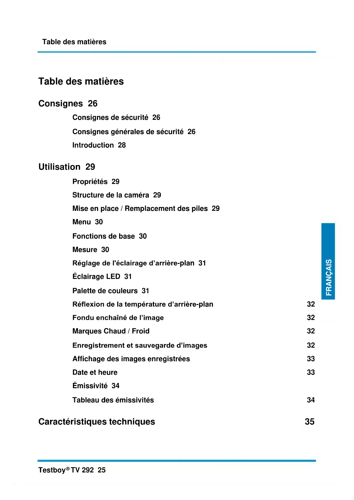TV 292 25 ENGLISH FRANÇAIS Table des matières Consignes 26 Consignes de sécurité 26 Consignes générales de sécurité 26 Introduction 28 Utilisation 29 Propriétés 29 Structure de la caméra 29 Mise en place / Remplacement des piles 29 Menu 30 Fonctions de base 30 Mesure 30 Réglage de l'éclairage d’arrière-plan 31 Éclairage LED 31 Palette de couleurs 31 Réflexion de la température d’arrière-plan 32 Fondu enchaîné de l’image 32 Marques Chaud / Froid 32 Enregistrement et sauvegarde d’images 32 Affichage des images enregistrées 33 Date et heure 33 Émissivité 34 Tableau des émissivités 34 Caractéristiques techniques 35Consignes 26 Testboy