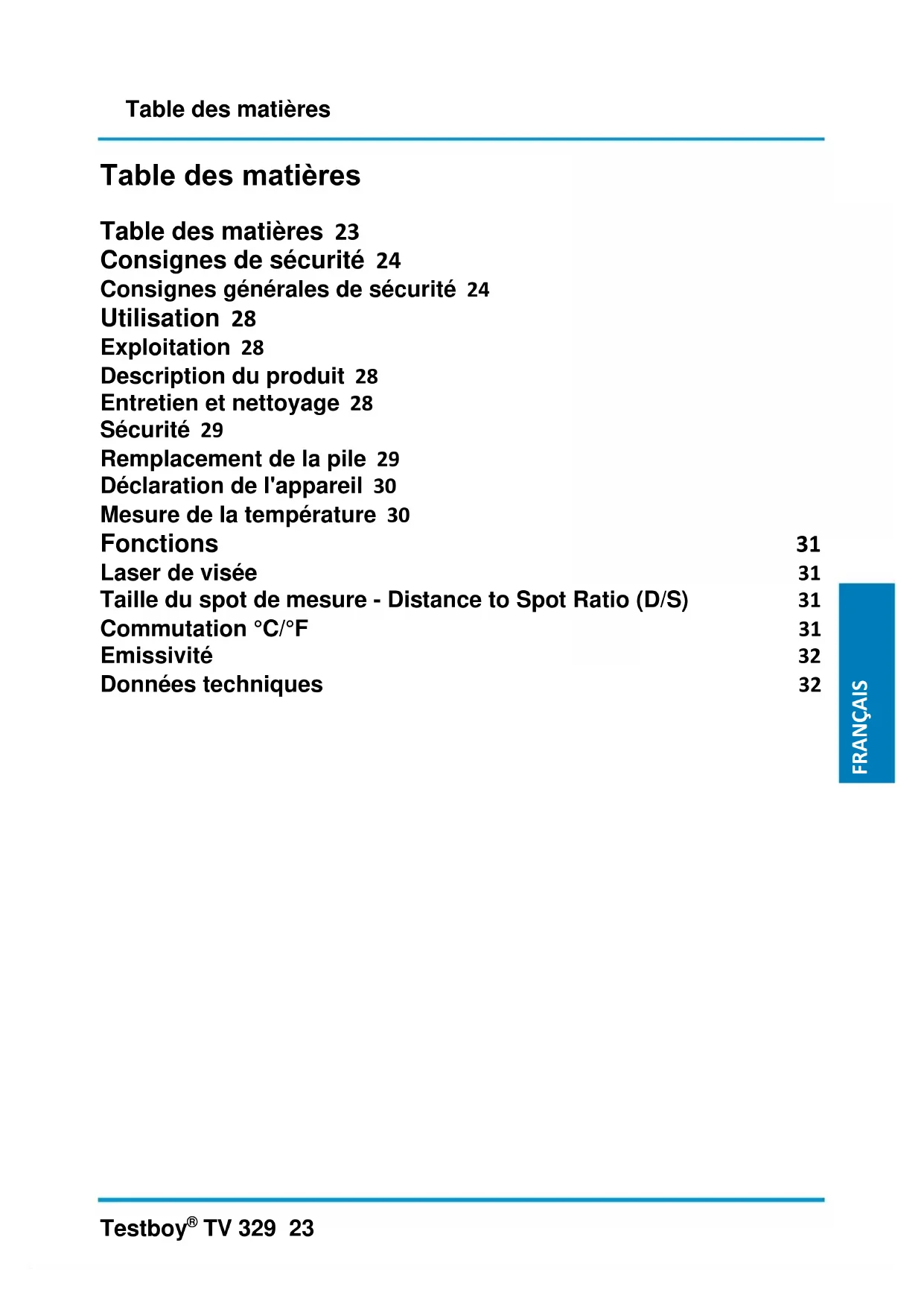 TV 329 23 FRANÇAIS Table des matières Table des matières 23 Consignes de sécurité 24 Consignes générales de sécurité 24 Utilisation 28 Exploitation 28 Description du produit 28 Entretien et nettoyage 28 Sécurité 29 Remplacement de la pile 29 Déclaration de l'appareil 30 Mesure de la température 30 Fonctions 31 Laser de visée 31 Taille du spot de mesure - Distance to Spot Ratio (D/S) 31 Commutation °C/°F 31 Emissivité 32 Données techniques 32Consignes de sécurité 24 Testboy