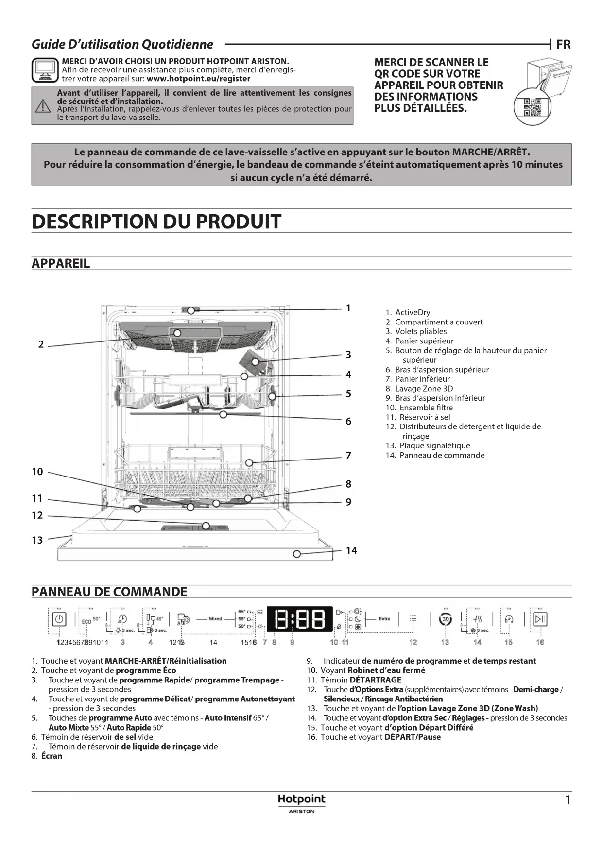 APPAREIL 1. ActiveDry2. Compartiment a couvert3. Volets pliables4. Panier supérieur5. Bouton de réglage de la hauteur du panier supérieur6. Bras d’aspersion supérieur7. Panier inférieur8. Lavage Zone 3D9. Bras d’aspersion inférieur10. Ensemble ltre11. Réservoir à sel12. Distributeurs de détergent et liquide de rinçage13. Plaque signalétique14. Panneau de commande