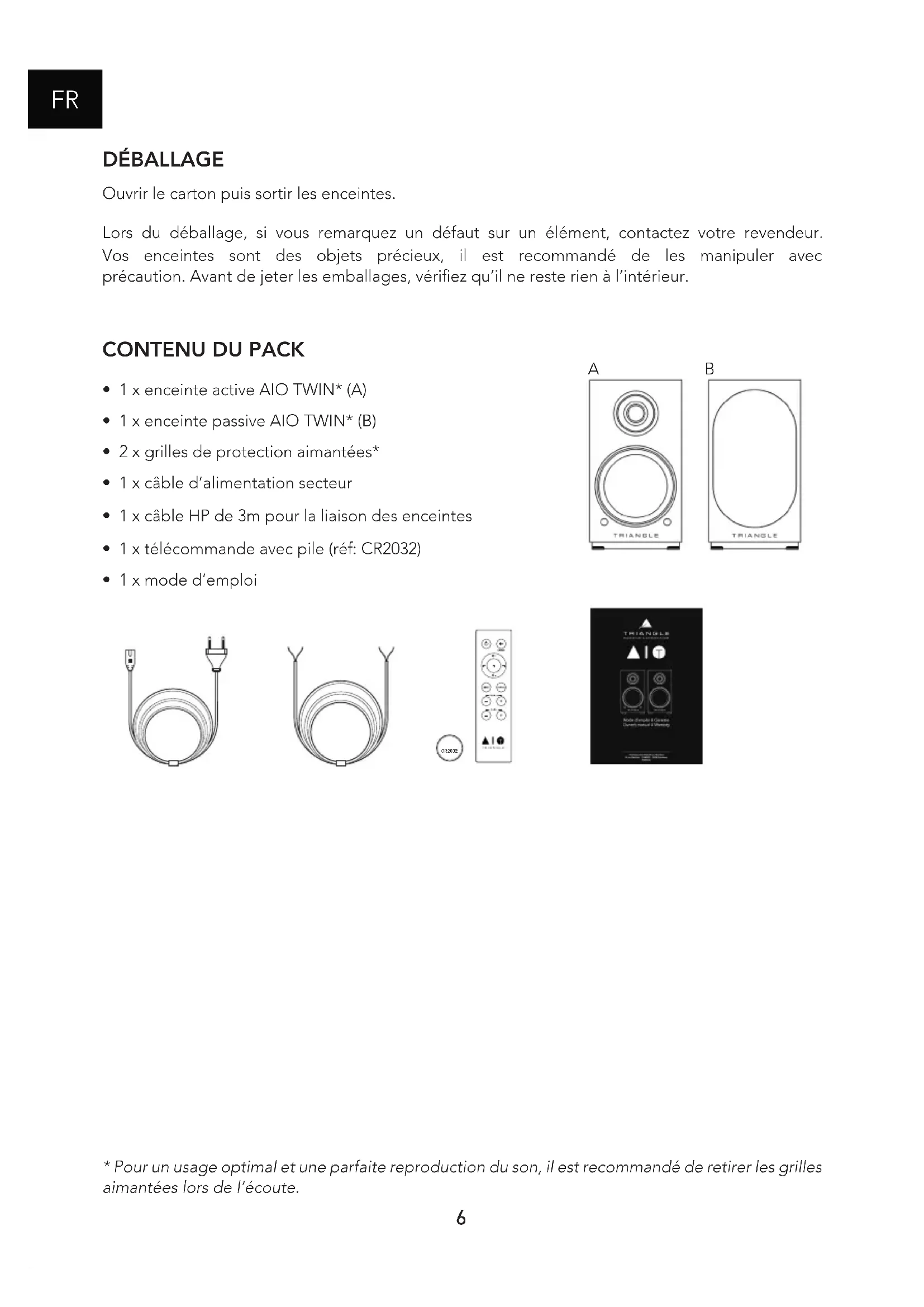 DÉBALLAGE Ouvrir le carton puis sortir les enceintes. Lors du déballage, si vous remarquez un défaut sur un élément, contactez votre revendeur. Vos enceintes sont des objets précieux, il est recommandé de les manipuler avec précaution. Avant de jeter les emballages, vérifiez qu’il ne reste rien à l’intérieur.
