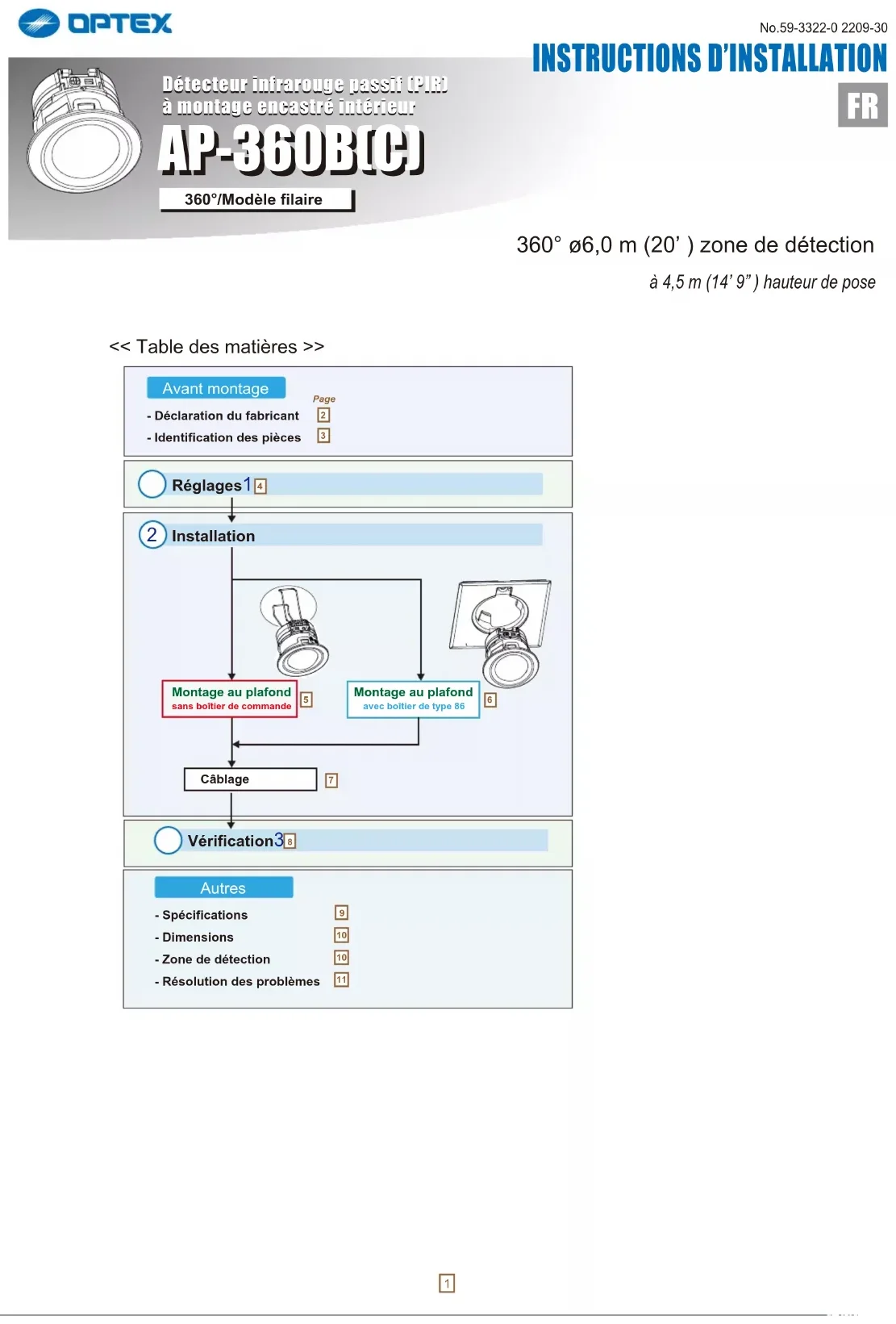 No.59-3322-0 2209-30 - Déclaration du fabricant- Identification des pièces- Spécifications- Dimensions- Zone de détection- Résolution des problèmesAvant montageAutres << Table des matières >> Page