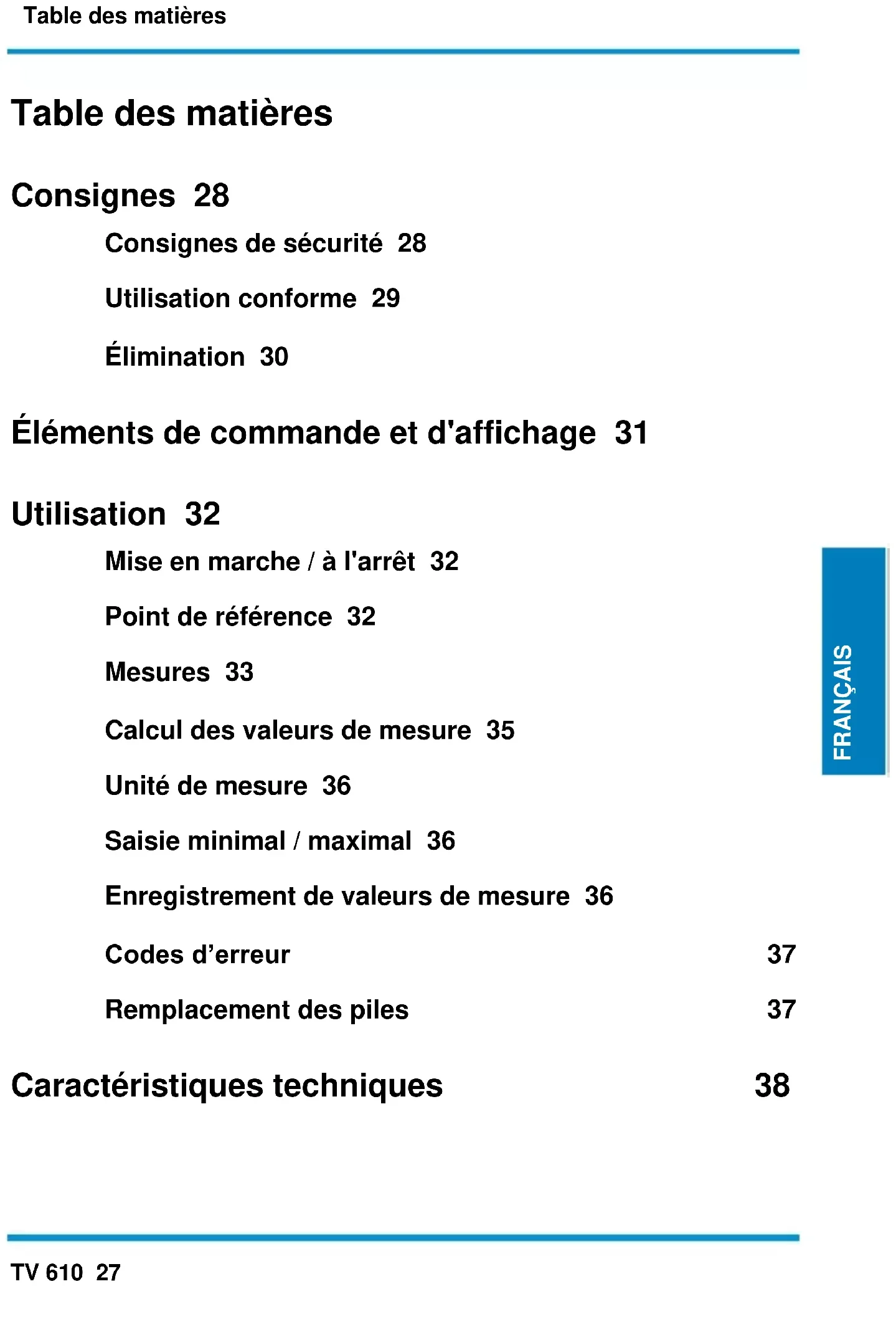Resolution: 1 mm Accuracy: ± 1.5 mm Response time: 500 ms Laser: 653 nm, < 1 mW (class 2) Operating temperature: 0 – 40 °C Storage temperature: -10 – 60 °C Dimensions LxWxH: 124 x 52 x 30 mm Weight: approx. 120 g incl. batteries Power supply 2 x 1.5 V AAA MicroTable des matières TV 610 27 FRANÇAIS FRANÇAIS FRANÇAIS Table des matières Consignes 28 Consignes de sécurité 28 Utilisation conforme 29 Élimination 30 Éléments de commande et d'affichage 31 Utilisation 32 Mise en marche / à l'arrêt 32 Point de référence 32 Mesures 33 Calcul des valeurs de mesure 35 Unité de mesure 36 Saisie minimal / maximal 36 Enregistrement de valeurs de mesure 36 Codes d’erreur 37 Remplacement des piles 37 Caractéristiques techniques 38Consignes 28 TV 610 Consignes Consignes de sécurité