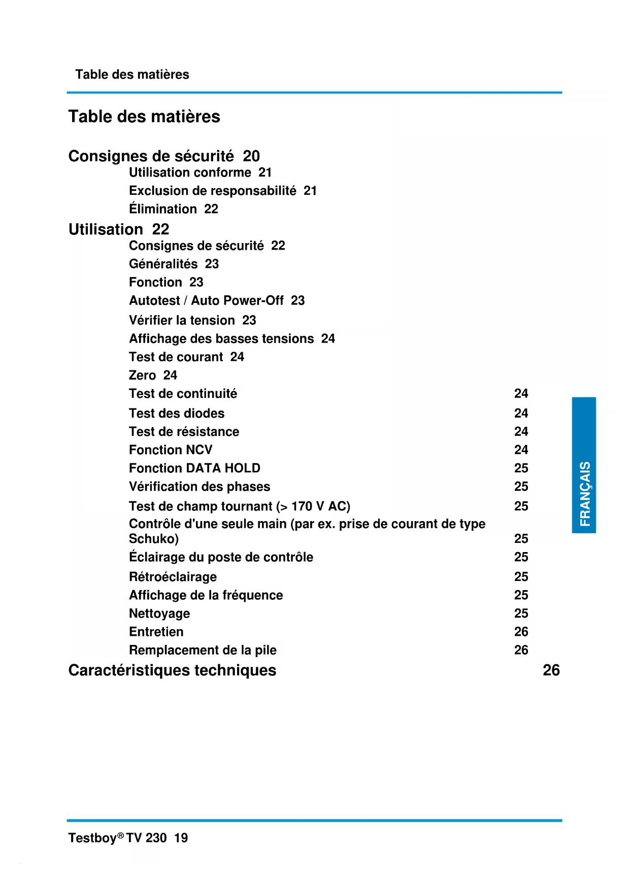 TV 230 19 FRANÇAIS Table des matières Consignes de sécurité 20 Utilisation conforme 21 Exclusion de responsabilité 21 Élimination 22 Utilisation 22 Consignes de sécurité 22 Généralités 23 Fonction 23 Autotest / Auto Power-Off 23 Vérifier la tension 23 Affichage des basses tensions 24 Test de courant 24 Zero 24 Test de continuité 24 Test des diodes 24 Test de résistance 24 Fonction NCV 24 Fonction DATA HOLD 25 Vérification des phases 25 Test de champ tournant (> 170 V AC) 25 Contrôle d'une seule main (par ex. prise de courant de type Schuko) 25 Éclairage du poste de contrôle 25 Rétroéclairage 25 Affichage de la fréquence 25 Nettoyage 25 Entretien 26 Remplacement de la pile 26 Caractéristiques techniques 26Consignes de sécurité 20 Testboy