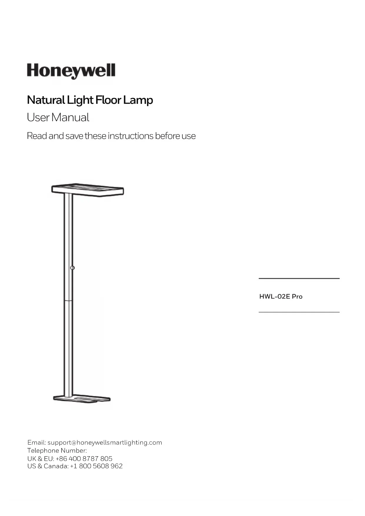 Carte de garantie 8Le Lampadaire Honeywell à Lumière Naturelle HWL-02E Pro adopte 528 perles de lampe LED Bridgelux Vesta® Thrive™ à spectre complet, qui diffusent la lumière naturelle la plus proche. Avec un CRI≥97, elles ne présentent ni lumière bleue, ni éblouissement, ni scintillement. Fabriquée en alliage d’aluminium et en fer, la lampe est solide et durable. Avec un grand panneau émetteur de lumière de 10400LM ainsi que des sources de lumière doubles supérieures et inférieures, elle peut éclairer tout votre espace grâce à la réflexion diffuse du plafond pour simuler la lumière du soleil. Créant un environnement doux et confortable pour les yeux, la lampe est idéale pour la lecture, l’étude, le dessin et d’autres activités. Source lumineuse saine et sûre: Les tests de dangerosité de la lumière stroboscopique et de la lumière bleue ont permis de vérifier que la lampe respecte ou dépasse les normes afin de protéger efficacement les yeux des utilisateurs. Protection oculaire professionnelle CCT: Sous une température de couleur douce de 4000K, les utilisateurs peuvent rapidement ajuster la luminosité à l’aide du bouton. Double source de lumière supérieure et inférieure: Grâce à une réflexion diffuse simulant la lumière du soleil, la lampe fournit une lumière uniforme de haute luminosité, ce qui permet de réduire la différence par rapport à la luminosité ambiante. Conception ergonomique du grand lampadaire: Un grand panneau lumineux rectangulaire est placé au-dessus de la tête, remplissant la pièce de lumière comme le soleil. Le diffuseur de la tête de lampe est équipé d’une structure prismatique qui rend la lumière douce et uniforme. Design en métal solide: Le corps principal est fait d’un alliage d’aluminium et de fer et la structure en forme de U du corps le rend solide et durable. Nous vous remercions d’avoir acheté notre Lampadaire Honeywell à Lumière Naturelle. Avant d’utiliser le produit, veuillez lire attentivement ce manuel d’utilisation afin de comprendre ses fonctions et les précautions à prendre. Lampadaire Honeywell à Lumière Naturelle REMERCIEMENTS