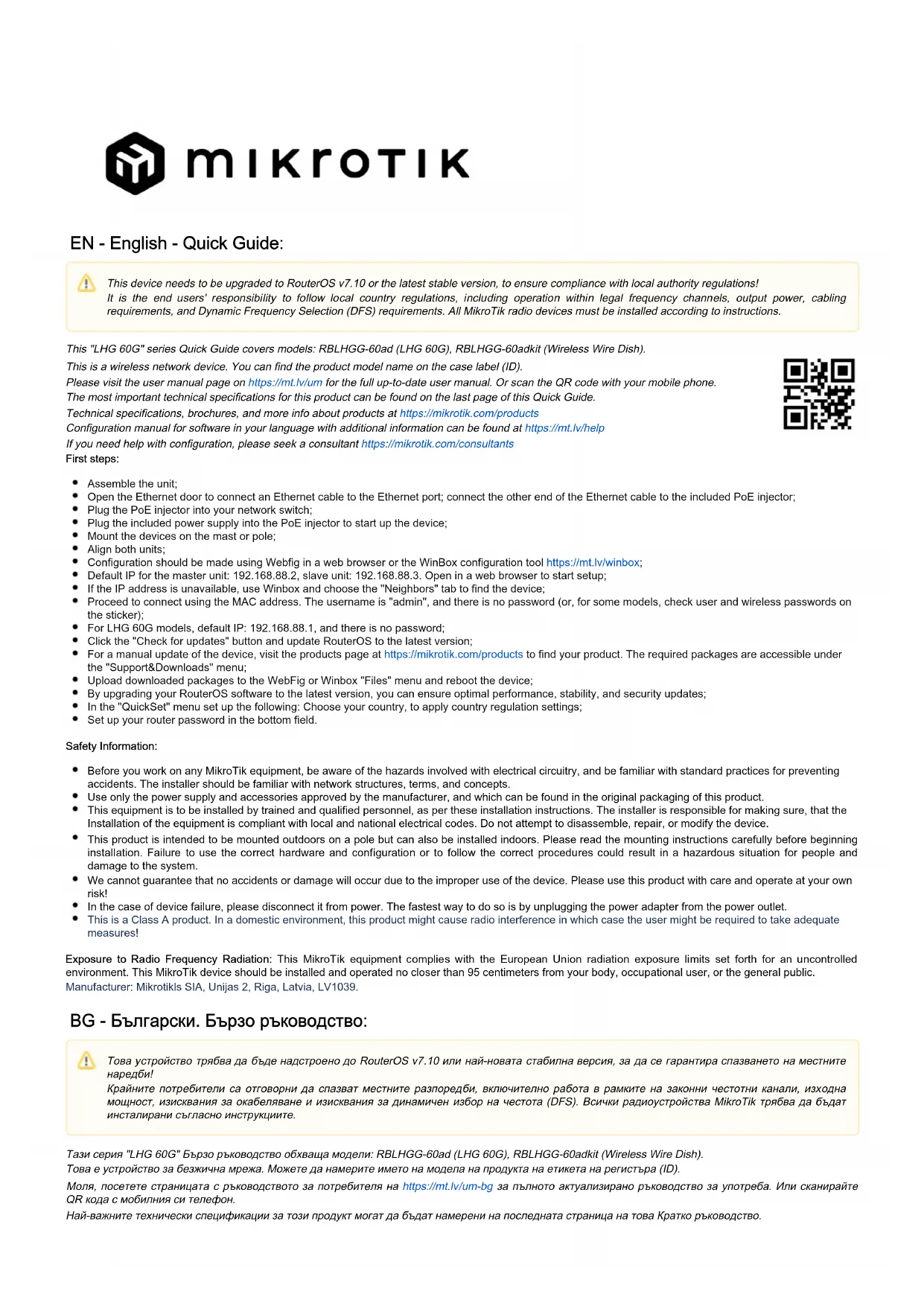 Vous pouvez trouver le nom du modèle du produit sur l'étiquette du boîtier (ID). Veuillez visiter la page du manuel d'utilisation sur pour le manuel d'utilisation complet et à jour.https://mt.lv/um-fr Ou scannez le code QR avec votre téléphone portable. Les spécifications techniques les plus importantes de ce produit se trouvent sur la dernière page de ce guide rapide. Spécifications techniques, brochures et plus d'informations sur les produits surhttps://mikrotik.com/products Vous trouverez le manuel de configuration du logiciel dans votre langue avec des informations supplémentaires sur https://mt.lv/help-fr Si vous avez besoin d'aide pour la configuration, veuillez consulter un consultant https://mikrotik.com/consultants Premiers pas: Assemblez l'unité ; Ouvrez la porte Ethernet pour connecter un câble Ethernet au port Ethernet; connectez l'autre extrémité du câble Ethernet à l'injecteur PoE inclus ; Branchez l'injecteur PoE sur votre commutateur réseau ; Branchez l'alimentation incluse dans l'injecteur PoE pour démarrer l'appareil ; Montez les appareils sur le mât ou le poteau ; Alignez les deux unités ; La configuration doit être effectuée à l'aide de Webfig dans un navigateur web ou de l'outil de configuration WinBox ;https://mt.lv/winbox Adresse IP par défaut pour l'unité principale : 192.168.88.2, unité esclave : 192.168.88.3. Ouvrez dans un navigateur web pour commencer la configuration ; Si l'adresse IP n'est pas disponible, utilisez Winbox et choisissez l'onglet "Neighbors" pour trouver l'appareil ; Procédez à la connexion en utilisant l'adresse MAC. Le nom d'utilisateur est "admin", et il n'y a pas de mot de passe (ou, pour certains modèles, vérifiez les mots de passe utilisateur et sans fil sur l'étiquette) ; Pour les modèles LHG 60G, l'IP par défaut est : 192.168.88.1, et il n'y a pas de mot de passe ; Cliquez sur le bouton " " et mettez à jour RouterOS vers la dernière version ;Check for updates Pour une mise à jour manuelle de l'appareil, visitez la page des produits sur pour trouver votre produit. Les paquets nécessaires https://mikrotik.com/products sont accessibles sous le menu "Support&Downloads" ; Téléchargez les paquets téléchargés dans le menu "Files" de WebFig ou Winbox et redémarrez l'appareil ; En mettant à jour votre logiciel RouterOS vers la dernière version, vous pouvez garantir des performances optimales, la stabilité et les mises à jour de sécurité