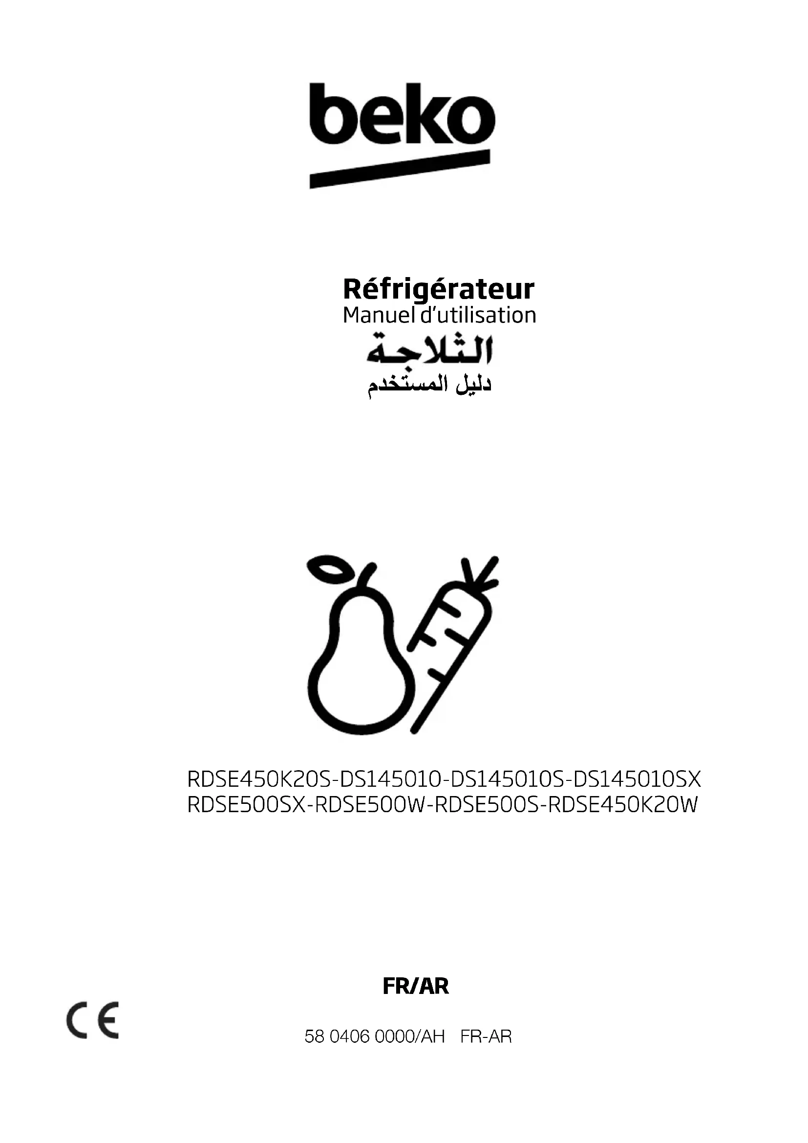 FR/AR Réfrigérateur Manuel d’utilisation 58 0406 0000/AH FR-ARVeuillez commencer par lire ce manuel d’utilisation! Cher client, Nous espérons que votre produit, qui a été fabriqué dans des usines modernes et vérifié au terme des procédures de contrôle de qualité les plus méticuleuses, vous donnera entière satisfaction. Veuillez donc lire attentivement l'intégralité de ce manuel avant de commencer à utiliser le produit et conservez-le manuel comme référence. Si vous remettez cet appareil à quelqu'un d'autre, remettez-lui également le manuel d'utilisation. Ce manuel vous aidera à utiliser votre produit ent toute sécurité et efficacement. Lisez le manuel avant d’installer et de faire fonctionner votre produit. Veillez à lire les instructions de sécurité. Laissez ce manuel dans un endroit facile d’accès car vous pourriez en avoir besoin ultérieurement. Lisez également la documentation fournie avec le produit. N'oubliez pas que le manuel d'utilisation est également valable pour plusieurs autres modèles. Les différences entre les différents modèles seront identifiées dans le manuel. Explication des symboles Les symboles ci-dessous sont utilisés dans le manuel d'utilisation: C Informations importantes ou astuces. A Avertissement relatif aux situations dangereuses pour la vie et la propriété. B Avertissement relatif à la tension électrique.FR