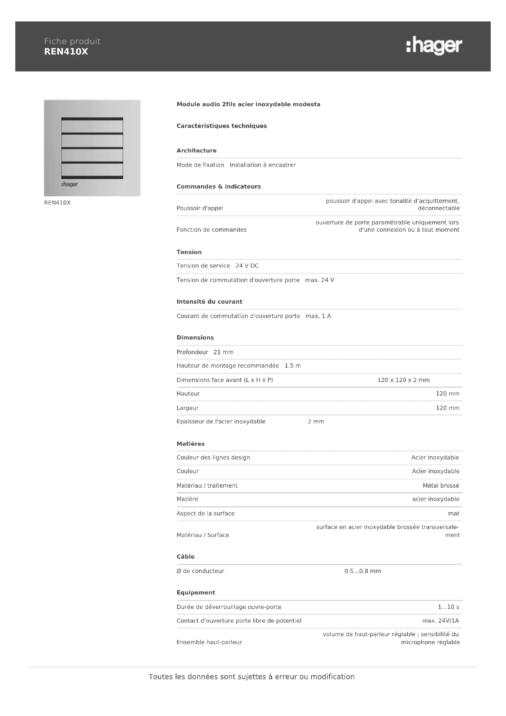 REN410X REN410X Module audio 2fils acier inoxydable modesta Caractéristiques techniques Architecture Mode de fixation Installation à encastrer Commandes & indicateurs Poussoir d'appel poussoir d'appel avec tonalité d’acquittement, déconnectable Fonction de commandes ouverture de porte paramétrable uniquement lors d'une connexion ou à tout moment Tension Tension de service 24 V DC Tension de commutation d'ouverture porte max. 24 V Intensité du courant Courant de commutation d'ouverture porte max. 1 A Dimensions Profondeur 21 mm Hauteur de montage recommandée 1.5 m Dimensions face avant (L x H x P) 120 x 120 x 2 mm Hauteur 120 mm Largeur 120 mm Epaisseur de l'acier inoxydable 2 mm Matières Couleur des lignes design Acier inoxydable Couleur Acier inoxydable Matériau / traitement Métal brossé Matière acier inoxydable Aspect de la surface mat Matériau / Surface surface en acier inoxydable brossée transversale‐ ment Câble Ø de conducteur 0.5…0.8 mm Equipement Durée de déverrouillage ouvre-porte 1…10 s Contact d'ouverture porte libre de potentiel max. 24V/1A Ensemble haut-parleur volume de haut-parleur réglable ; sensibilité du microphone réglable Toutes les données sont sujettes à erreur ou modificationUtilisation Technologie du système 2 fils Conditions d'utilisation Température de service -20…55 °C Température de stockage/transport -30…80 °C Humidité relative de l'air (sans condensa‐ tion) 0…65 % (sans condensation) Toutes les données sont sujettes à erreur ou modification
