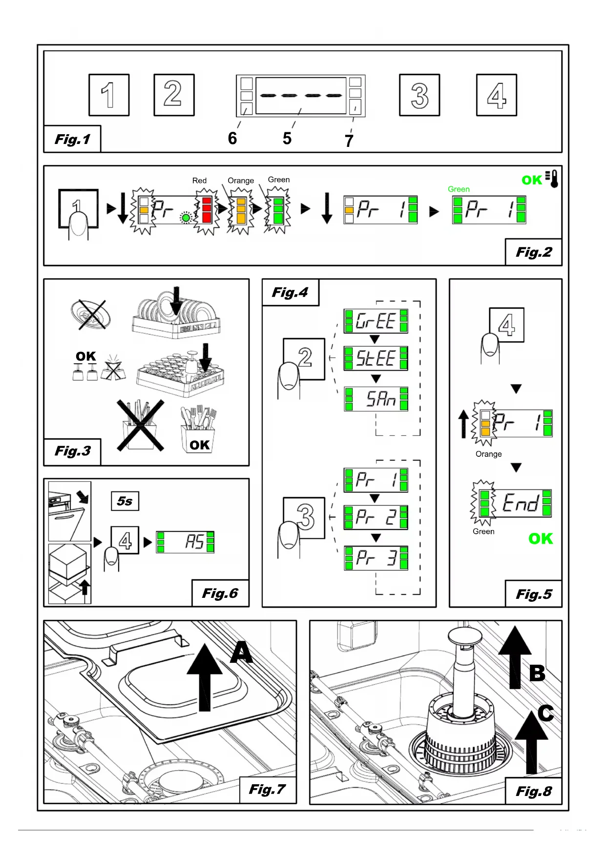 Faire référence à la Fig.2 : Enclencher l'interrupteur général et ouvrir le robinet d'arrivée d'eau. Vérifier la présence de l'éventuel trop-plein. Appuyer sur le bouton ON/OFF (1). La BARRE DE CONTRÔLE (7) s'illumine pour indiquer le déroulement du contrôle, en passant du rouge au vert. En cas d'une anomalie grave, la barre à LED s'illuminera de couleur rouge, et le fonctionnement du lave-vaisselle sera interrompu. Une erreur peu importante sera, par contre, signalée de couleur orange et n'arrêtera pas le fonctionnement du lave-vaisselle. Le remplissage commence automatiquement à l'allumage du lave-vaisselle. Le point sur l'afficheur clignote jusqu'au moment où le niveau est atteint. La BARRE D'ÉTAT (6) s'illumine du haut vers le bas, en indiquant le chauffage de l'eau de lavage en cours. La BARRE D'ÉTAT (6) reste allumée de couleur verte lorsque la température de lavage est atteinte. Les conditions optimales pour commencer le lavage sont maintenant remplies.