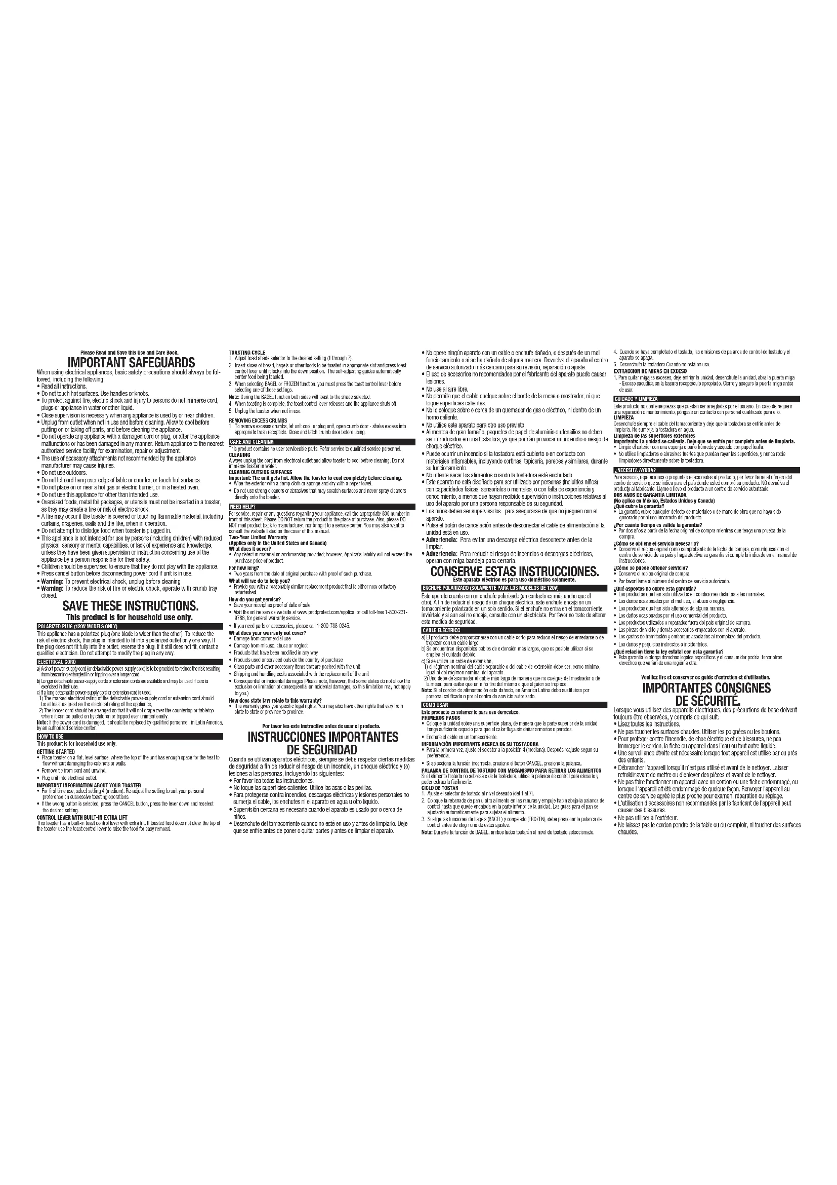 Cet appareil est conçu pour un usage domestique seulement. FICHE POLARISÉE (MODÈLES DE 120 V SEULEMENT) L’appareil est muni d’une fi che polarisée (une lame plus large que l’autre). Afi n de minimiser les risques de secousses électriques, ce genre de fi che n’entre que d’une façon dans une prise polarisée. Lorsqu’on ne peut insérer la fi che à fond dans la prise, il faut tenter de le faire après avoir inversé les lames de côté. Si la fi che n’entre toujours pas dans la prise, il faut ommuniquer avec un électricien certifi é. Il ne faut pas tenter de modifi er la fi che. CORDONa) Le cordon d’alimentation de l’appareil est court (ou amovible) afi n de minimiser les risques d’enchevêtrement ou de trébuchement.b) Il existe des cordons d’alimentation amovibles ou de rallonge plus longs et il faut s’en servir avec prudence.c) Lorsqu’on utilise un cordon d’alimentation amovible ou de rallonge plus long, il faut s’assurer que : 1) la tension nominale du cordon d’alimentation amovible ou de rallonge soit au moins égale à celle de l’appareil, et que; 2) le cordon plus long soit placé de sorte qu’il ne soit pas étalé sur le comptoir ou la table d’où des enfants pourraient le tirer, ni placé de manière à provoquer un trébuchement. Note: Lorsque le cordon d’alimentation est endommagé, il faut le faire remplacer par du personnel qualifié ou, en Amérique latine, par le personnel d’un centre de service autorisé.UTILISATIONCe produit est destiné à un usage domestique seulement.POUR COMMENCER• Placer sur une surface plane et horizontale, où le dessus de l’appareil a suffisamment d’espace pour la chaleur de circuler sans endommager les armoires ou les murs.• Enlever l’attache du cordon et se détendre.• Branchez l’appareil dans une prise électrique.INFORMATIONS IMPORTANTES CONCERNANT VOTRE PAIN• Pour la première utilisation, sélectionnez le réglage 4 (moyenne). Réajuster le réglage en fonction de vos préférences personnelles sur les opérations successives de grillage.• Si le mauvais bouton est sélectionné, appuyez sur le bouton CANCEL, appuyez sur le levier vers le bas et sélectionnez de nouveau le réglage désiré.LEVIER DE COMMANDE AVEC EXTRACe grille-pain est un levier intégré dans le pain grillé de contrôle avec ascenseur supplémentaire. Si la nourriture grillée n’efface pas le haut de la grille d’utiliser le levier de commande pour élever la nourriture pour un retrait facile.CYCLE DE GRILLAGE1. Régler le sélecteur du degré de grillage au réglage désiré (1 à 7).2. Insérer les tranches de pain, des bagels ou d’autres aliments à griller dans la fente appropriée et le levier de commande de la presse toasts jusqu’à ce qu’il se verrouille en position basse. Les guides d’auto-réglage automatique alimentaire centre étant grillé.3. Lors de la sélection ou de la fonction BAGEL SURGELÉ, vous devez appuyer sur le levier de commande avant de choisir l’un de ces paramètres. Remarque : lorsque la fonction Bagel est sélectionnée, les deux côtés grilleront en fonction du degré choisi.4. Lorsque le grillage est terminé, les communiqués de pain grillé levier de commande et l’appareil s’éteint.5. Débrancher le grille-pain lorsqu’il n’est pas utilisé.RETRAIT DES MIETTES EXCÉDENTAIRES1. Pour enlever les miettes exceses, laissez refroidir l’unité, débranchez l’appareil, ouvrez la porte miette - excès de bougé en réceptacle poubelle appropriée. Fermez et verrouillez la porte avant de l’utiliser miette.ENTRETIEN ET NETTOYAGECe produit ne contient aucune pièce réparable. Confiez les réparations à un personnel qualifié.NETTOYAGEToujours débrancher le cordon de la prise électrique et laissez refroidir grille-pain avant de le nettoyer. Ne pas immerger grille-pain dans l’eau.NETTOYAGE DES SURFACES EXTÉRIEURESImportant: L’appareil devient chaud. Laisser le pain refroidir complètement avant de le nettoyer.• Essuyez l’extérieur avec un chiffon ou une éponge humide et sécher avec une serviette en papier.• Ne pas utiliser de nettoyants forts ou abrasifs qui pourraient rayer les surfaces et les produits de nettoyage ne jamais directement sur le grille-pain.BESOIN D’AIDE?Pour communiquer avec les services d’entretien ou de réparation, ou pour adresser toute question relative au produit, composer le numéro sans frais approprié indiqué sur la page couverture. Ne pas retourner le produit où il a été acheté. Ne pas poster le produit au fabricant ni le porter dans un centre de service. On peut également consulter le site web indiqué sur la page couverture.Garantie limitée de deux ans (Valable seulement aux États-Unis et au Canada)Quelle est la couverture?