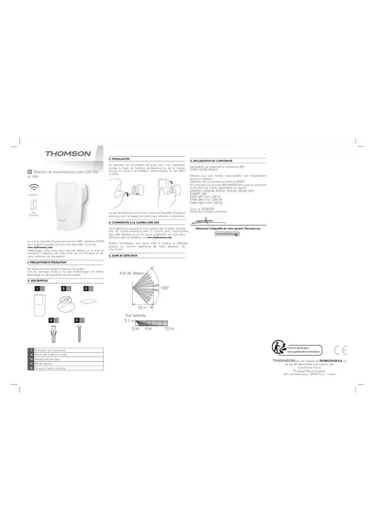 Déclare sous son entière responsabilité que l’équipement désigné ci-dessous : Détecteur de mouvement pet-immune 512505 Est conforme à la directive RED 2014/53/UE et que sa conformité a été selon les normes applicables en vigueur : EN60950-1 :2006+A11 :2009+A1 :2010+A12 :2011+A2 :2013 EN62479 :2010 EN301 489-1 V2.1.1 :2017-02 EN301 489-3 V1.6.1 :2013-08 EN300 220-2 V3.1.1 :2017-02 Tours, le 30/04/2019 Alexandre Chaverot, président Retrouvez l’intégralité de notre gamme Thomson sur Pour en savoir plus : www.quefairedemesdechets.fr est une marque de TECHNICOLOR S.A. ou de ses affi liées utilisée sous licence par : SmartHome France 19 avenue Marcel Dassault ZAC des Deux Lions - 37200 Tours - FranceThe full LENS 200 pack security instructions, reference 512502 for which the product is envisaged is available on the site www.mythomson.com. Download these instructions for more details on setting up and using your Thomson security pack and your motion detector.