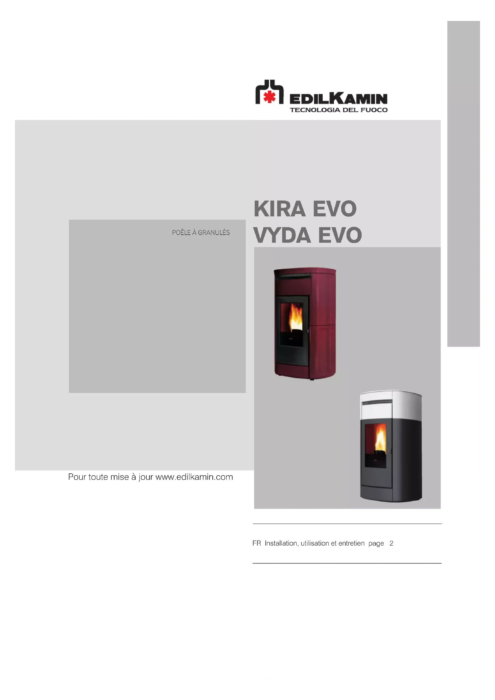 KIRA EVO VYDA EVO Pour toute mise à jour www.edilkamin.com2 FRANÇAIS EDILKAMIN S.p.a. ayant son siège social Via P. Moscati 8 - 20154 Milan - Code Fiscal et N° TVA 00192220192 Déclare sous sa propre responsabilité que : Le poêle à granulés ci-dessous est conforme à la réglementation UE 305/2011 et à la norme européenne harmonisée EN 14785:2006 POÊLES À GRANULÉS, marque commerciale EDILKAMIN, dénommés KIRA EVO - VYDA EVO N° de SÉRIE: Réf. Plaque données KIRA EVO - VYDA EVO: Déclaration de conformité: (DoP - EK n° 202) La société déclare en outre que : les poêles à granulés de bois KIRA EVO - VYDA EVO respectent les exigences des directives européennes suivantes: 2014/35/UE - Directive basse tension 2014/30/UE - Directive compatibilité électromagnétique 2011/65/UE - Directive RoHS 2009/125/UE - Écoconception 2010/30/UE - Étiquetage UTILISATEUR/INSTALLATEUR Traduction de l’édition originale italienne3 FRANÇAIS