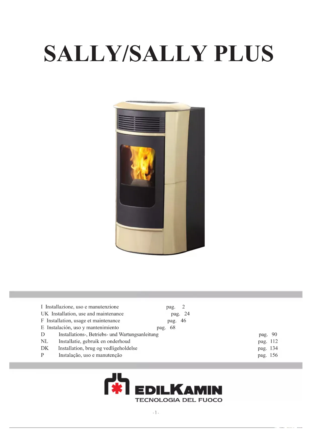 - The combustion chamber is inserted properly into the relevant compartment REMEMBER TO VACUUM THE COMBUSTION CHAMBER BEFORE EACH IGNITION Should ignition fail, DO NOT re-ignite until you have emptied the combustion chamber. In accordance with art. 26 of Legislative Decree no. 49 of 14th March 2014, “Implementation of Directive 2012/19/UE on the disposal of electrical and electronic devices (RAEE)”. The crossed-out dustbin symbol displayed on equipment or its packaging indicates that the product at the end of its life must be collected separately from other waste. At the end of its useful life, the user should therefore deliver the product to a suitable local sorted collection centre for electrical and electronic devices. Sorted collection for recycling, treatment and environmentally compatible scrapping contributes to the prevention of negative effects on the environment and health, and promotes the re-use and recycling of the materials of which the equipment is made.- 46 - FRANÇAIS Madame / Monsieur Nous vous remercions et nous vous félicitons d’avoir choisi notre produit. Avant de l’utiliser, nous vous demandons de lire attentivement cette che, an de pouvoir exploiter au mieux et en toute sécurité les performances de votre appareil. Pour tout autre renseignement ou nécessité, contactez le REVENDEUR chez lequel vous avez effectué votre achat ou visitez notre site internet www.edilkamin.com à la rubrique CENTRES D’ASSISTANCE TECHNIQUE. REMARQUE - Après avoir déballé le produit, assurez-vous que son contenu soit intact et complet (radiocommande, revêtement, poignée « main froide », rosace sortie des fumées par le top, livret de garantie, gant, che technique, spatule, sels hygroscopiques). En cas d’anomalies, adressez-vous tout de suite au revendeur chez lequel vous avez effectué l’achat et remettez-lui une copie du livret de garantie et de la facture. - Mise en service/test Elle doit être obligatoirement effectuée par le – Centre d’Assistance Technique – autorisé EDILKAMIN (CAT) sous peine de voir la garantie expirer. La mise en service telle qu’elle est décrite par la norme UNI 10683 consiste en une série d’opérations de contrôle qui sont effectuées une fois le poêle installé et qui ont pour but de vérier que le système fonctionne bien et qu’il est en accord avec les règlementations. Chez votre revendeur, sur le site www.edilkamin.com ou en appelant le numéro vert, vous pouvez trouver le Centre d’Assistance le plus proche de chez vous. - Des installations incorrectes, des entretiens mal effectués, une utilisation impropre du produit, déchargent l’entreprise productri- ce de tout dommage éventuel découlant de l’utilisation du produit. - le numéro du coupon de contrôle, nécessaire pour l’identication du poêle, est indiqué : - sur le haut de l’emballage - sur le livret de garantie qui se trouve à l’intérieur du foyer - sur la plaquette appliquée à l’arrière de l’appareil ; Cette documentation ainsi que la facture doivent être conservées pour l’identication, et les informations qu’elles contiennent devront être communiquées à l’occasion d’éventuelles demandes de renseignements et mises à disposition pour une éventuelle intervention d’entretien ; - les détails représentés sont indicatifs, du point de vue graphique et géométrique. La société soussignée EDILKAMIN S.p.A. avec siège légal Rue Vincenzo Monti 47 - 20123 Milano - Cod. Fiscal P.IVA 00192220192 Déclare sous sa propre responsabilité: Le poêle à pellets indiqué ci-dessous est conforme au règlement UE 305/2011 (CPR) et à la norme européenne harmonisée EN 14785:2006 POÊLES À PELLET, de marque commerciale EDILKAMIN, dénommé SALLY - SALLY PLUS N° DE SÉRIE: Réf. Plaque des caractéristiques Déclaration de performance (DoP - EK 106): Réf. Plaque des caractéristiques De plus, elle déclare que : Le poêle à pellet de bois SALLY - SALLY PLUS respecte les exigences des directives européennes : 2006/95/CEE - Directive de Basse Tension 2004/108/CEE - Directive de Compatibilité Électromagnétique EDILKAMIN S.p.A. décline toute responsabilité envers le dysfonctionnement de l’appareil en cas de remplacement, montage et/ou modications effectuées par un personnel non autorisé par EDILKAMIN.- 47 - FRANÇAIS