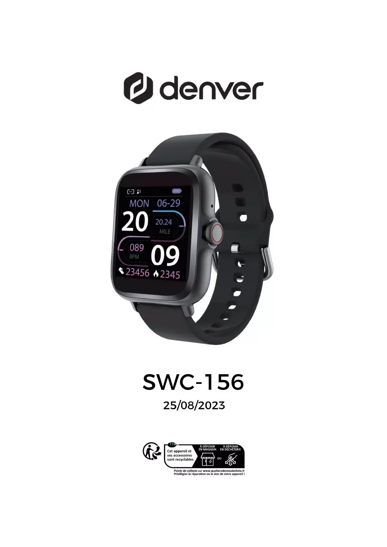 - Depuis l'interface de veille, balayez vers la gauche ou la droite pour changer de cadran. Système trois en un de surveillance de la fréquence cardiaque, de la pression artérielle, du taux d’oxygène dans le sang Après être entré dans l'interface trois en un de test de fréquence cardiaque pen- dant quelques secondes, les résultats actuels des tests de fréquence cardiaque, de pression artérielle et de taux d'oxygène sanguin s'achent. Systèmes pris en charge: Android 5.0 et plus récent; iOS 9.0 et plus récenFRA-5 Remarque - Tous les produits sont susceptibles d’être modifiés sans préavis. Ce document est établi sous toute réserve d’erreur et d’omission. TOUS DROITS RÉSERVÉS, COPYRIGHT DENVER A/S Annuaire téléphonique Ajoutez jusqu'à 10 contacts fréquents via l'application. Une fois la connexion entre la montre connectée et l'application Bluetooth réussie, les contacts peuvent être synchronisés avec le répertoire de la montre connectée et achés. Cliquez sur les contacts pour passer un appel. (Remarque : le téléphone doit également être connecté à la montre connectée.) Mode Sommeil Lorsque vous vous endormez, la montre connectée entrera automatiquement en mode de surveillance du sommeil ; surveillera automatiquement votre état de sommeil profond/sommeil léger/éveillé toute la nuit, calculera la qualité de votre sommeil. Le bracelet n'ache que la durée totale du sommeil profond/sommeil léger/sommeil: entrez dans l'application et achez les détails des données de sommeil. Remarque: Les données de sommeil seront disponibles lorsque vous porterez votre bracelet et le sommeil sera surveillé à partir de 22h. Application push Si la fonction est activée, lorsque vous recevez des messages SMS, WeChat, QQ, Facebook, etc., la montre connectée vibrera en guise de rappel et achera le contenu reçu de l'application. Fonctions et paramètres de l'application Infos personnelles Veuillez définir vos informations personnelles après avoir accédé à l'application. Allez dans Paramètres Informations personnelles, vous pouvez définir le sexe, l'âge, la taille, le poids, etc. Vous pouvez également définir votre objectif quotidien de pas.FRA-6 denver.eu Les équipements électriques et électroniques et les piles ou batteries qu’ils renferment contien- nent des matériaux, composants et substances qui peuvent nuire à votre santé et à l’environne- ment si ces déchets (appareils électriques et électroniques ainsi que piles et batteries) ne sont pas traités de façon appropriée. Les équipements électriques et électroniques, ainsi que les piles et batteries, sont marqués du symbole d’une poubelle barrée, comme illustré ci-dessus. Ce symbole indique que les appareils électriques et électroniques et les piles et batteries doivent être triés et jetés séparément des ordures ménagères. En tant qu’utilisateur final, il est important que vous jetiez les piles et batteries usagées dans des centres de collecte appropriés. En mettant au rebut les piles et batteries afin qu’elles soient recy- clées conformément à la réglementation, vous contribuez à préserver l’environnement. Toutes les municipalités disposent de points de collecte dans lesquels les appareils électriques et électroniques ainsi que les piles et batteries peuvent être déposés sans frais en vue de leur recy- clage, ou offrent des services de ramassage des déchets. Vous pouvez obtenir des informations supplémentaires auprès des services de votre municipalité. Par la présente, Denver A/S déclare que l'équipement radioélectrique du type SWC-156 est con- forme à la directive 2014/53/EU. Le texte intégral de la déclaration de conformité UE est disponible à l’adresse Internet suivante: denver.eu, et cliquez sur l’icône de recherche située en haut de la page. Numéro de modèle: SWC-156. Entrez dans la page produit, la directive RED se trouve dans Téléchargements/Autres téléchargements. Plage de fréquence de fonctionnement: 2402-2480MHz Puissance de sortie maximale: 0.28W