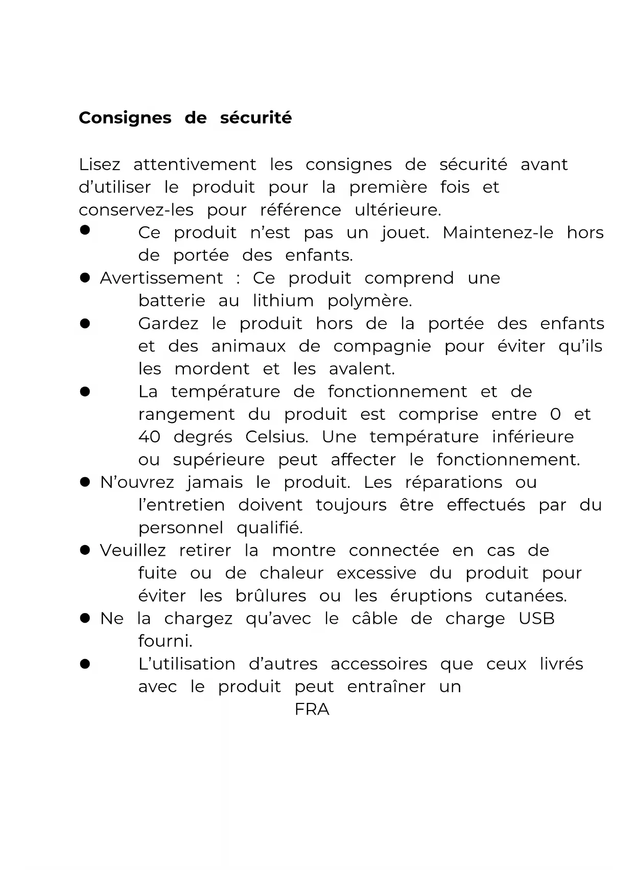 FRA 1 Consignes de sécurité Lisez attentivement les consignes de sécurité avant d’utiliser le produit pour la première fois et conservez-les pour référence ultérieure.