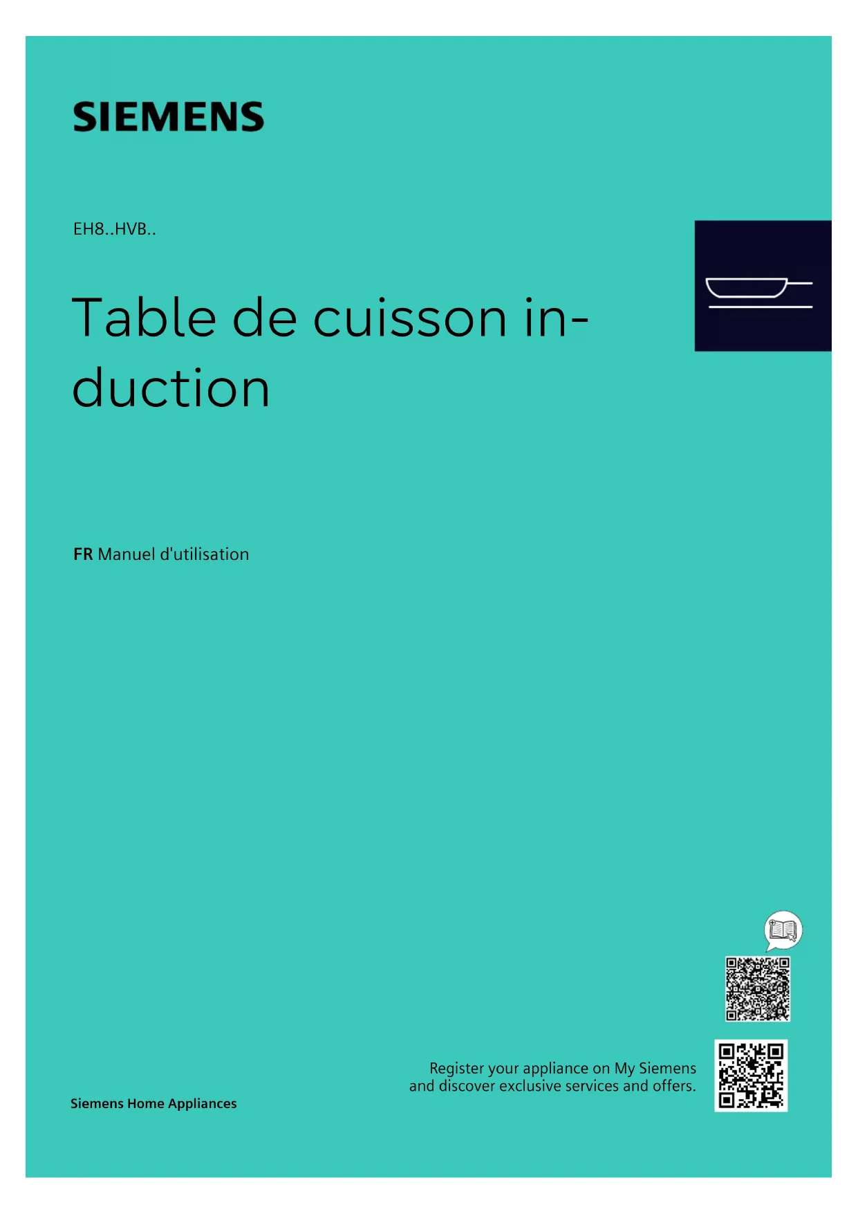 - Table de cuisson in- duction FR Manuel d'utilisation Siemens Home Appliances Register your appliance on My Siemens and discover exclusive services and offers.fr Table des matières Vous pouvez trouver d'autres informations et explications en ligne. Scannez le code QR sur la page de titre. Table des matièresTable des matières 1 Sécurité p. 2
