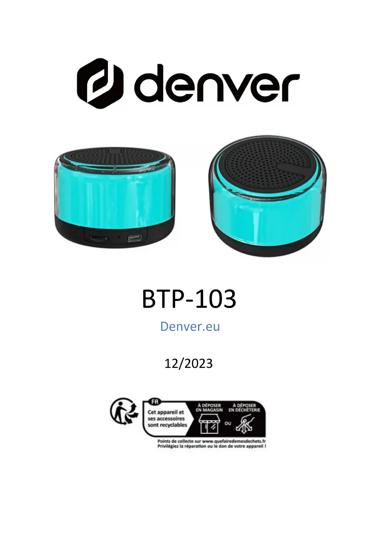BTP-103 Denver.eu 12/20232 Consignes de sécurité Lisez attentivement les consignes de sécurité avant d’utiliser le produit pour la première fois et conservez-les pour référence ultérieure. 1.Ce produit n’est pas un jouet. Maintenez-le hors de portée des enfants. 2.Avertissement : Ce produit contient des batteries au lithium-polymère 3.Gardez le produit hors de la portée des enfants et des animaux de compagnie pour éviter qu’ils les mordent et les avalent. 4.La température de fonctionnement et de rangement du produit est comprise entre 0 et 40 degrés Celsius. Une température inférieure ou supérieure peut affecter le fonctionnement. 5.N’ouvrez jamais le produit. Toucher les pièces électriques à l’intérieur peut provoquer une décharge électrique. Les réparations ou l’entretien doivent toujours être effectués par du personnel qualifié. 6.N’exposez pas l’appareil à la chaleur, l’eau, l’humidité et la lumière directe du soleil ! 7.Préservez vos oreilles d’un volume sonore élevé. Un volume sonore élevé peut endommager les oreilles et causer une perte d’acuité auditive. 8.La technologie sans fil Bluetooth peut fonctionner à une portée de 10 mètres (30 pieds). La distance de communication maximale peut varier selon la présence d’obstacles (personnes, objets métalliques,3 murs, etc.) ou de l’environnement électromagnétique. 9.Les micro-ondes émises par un appareil Bluetooth peuvent affecter le fonctionnement des appareils médicaux électroniques. 10.L’unité n’est pas étanche. Si de l’eau ou des objets pénètrent dans l’unité, cela peut causer un incendie ou une électrocution. Si de l’eau ou un objet pénètre dans l’unité, cessez immédiatement l’utilisation. 11.Ne chargez l’appareil qu’avec le câble USB inclus. 12.N’utilisez pas d’accessoires non officiels avec le produit, car cela peut causer un mauvais fonctionnement. Contenu 1 Enceinte 1 Câble de charge Type-C 1 Mode d’emploi 1 Longe Données techniques Version Bluetooth : V5.3 Entrée nominale : 5V-500mA Haut-parleur : 1 x 3W Batterie : 300mAh Plage de fréquences : 100 Hz – 18 KHz Portée du Bluetooth : Jusqu’à 10 mètres4 Vue d’ensemble du produit 1.Marche/Arrêt ; Allumer/éteindre l'éclairage 2.Mode Bluetooth, TF/TWS (Appui long pour la connexion TWS) 3.Bouton VOL-/Morceau précédent 4.Bouton VOL+/Morceau suivant 5.Lecture et Pause/Mains libres5 Marche/Arrêt Pour allumer et éteindre l'appareil, appuyez longuement sur le bouton Marche/Arrêt. Chargement de la batterie Pour le chargement, veuillez utiliser le câble de Type-C fourni. Branchez l’extrémité ayant une prise USB Type-C sur le port USB de l’appareil et l’autre extrémité dans le port USB sur le PC, le chargeur mural ou autres chargeurs de 5 V. Lecture de fichiers mp3 à partir de la carte Micro SD 1.Insérez la carte micro SD dans l’emplacement pour carte TF. 2.Vous pouvez lire, mettre en pause ou passer une piste sélectionnée à l'aide des commandes de l'enceinte. Utilisation du Bluetooth Si vous avez déjà utilisé la connexion Bluetooth, le système recherchera le dernier appareil connecté. Une fois l’appareil trouvé, le système se reconnectera automatiquement. Appairage initial d'un appareil Bluetooth 1.Allumez l'appareil. Vous entendrez une tonalité d’avertissement. 2.Allumez votre appareil externe. Reportez-vous à son mode d’emploi pour obtenir des instructions sur l’appairage et la connexion d'appareils Bluetooth.6 3.À l'aide des commandes de votre appareil Bluetooth d’origine, sélectionnez l’appareil « Denver BTP-103 » dans vos paramètres Bluetooth pour l’appairage. 4.Une appairé et connecté, l’unité émettra une tonalité d’avertissement. Après l’appairage initial, l’unité restera appairée jusqu’à ce que son appairage soit annulé manuellement par l’utilisateur. FAQ 1.N’utilisez aucun nettoyant abrasif pour nettoyer ce produit. 2.Gardez ce produit à l’écart du feu ou autres sources de chaleur, telles que les cuisinières. 3.Assurez-vous de ne pas exposer ce produit à la lumière directe du soleil pendant une période prolongée. 4.Ne jetez pas ce produit dans le feu, cela pourrait provoquer une explosion. 5.N'essayez jamais de démonter ou de modifier ce produit. Il ne contient aucun composant qui nécessite un entretien. 6.N’utilisez pas ce produit sous la pluie. 7.Si vous ne prévoyez pas d’utiliser ce produit pendant une période prolongée, stockez-le dans un environnement sec et chargez l'enceinte au moins une fois par mois pour prolonger sa durée de vie. Évitez les températures extrêmes et la poussière.7 Remarque - Tous les produits sont susceptibles d’être modifiés sans préavis. Ce document est établi sous toute réserve d’erreur et d’omission. TOUS DROITS RÉSERVÉS, COPYRIGHT DENVER A/S Les équipements électriques et électroniques et les piles ou batteries qu’ils renferment contiennent des matériaux, composants et substances qui peuvent nuire à votre santé et à l’environnement si ces déchets (appareils électriques et électroniques ainsi que piles et batteries) ne sont pas traités de façon appropriée. Les équipements électriques et électroniques, ainsi que les piles et batteries, sont marqués du symbole d’une poubelle barrée, comme illustré ci-dessus. Ce symbole indique que les appareils électriques et électroniques et les piles et batteries doivent être triés et jetés séparément des ordures ménagères. En tant qu’utilisateur final, il est important que vous jetiez les piles et batteries usagées dans des centres8 de collecte appropriés. En mettant au rebut les piles et batteries afin qu’elles soient recyclées conformément à la réglementation, vous contribuez à préserver l’environnement. Toutes les municipalités disposent de points de collecte dans lesquels les appareils électriques et électroniques ainsi que les piles 