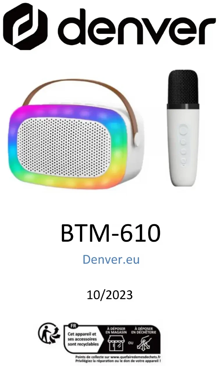 BTM-610 Denver.eu 10/20232 Consignes de sécurité Lisez attentivement les consignes de sécurité avant d’utiliser le produit pour la première fois et conservez-les pour référence ultérieure. 1.Ce produit n’est pas un jouet. Maintenez-le hors de portée des enfants. 2.Avertissement : Ce produit contient des batteries au lithium-polymère 3.Gardez le produit hors de la portée des enfants et des animaux de compagnie pour éviter qu’ils les mordent et les avalent. 4.La température de fonctionnement et de rangement du produit est comprise entre 0 et 40 degrés Celsius. Une température inférieure ou supérieure peut affecter le fonctionnement. 5.N’ouvrez jamais le produit. Toucher les pièces électriques à l’intérieur peut provoquer une décharge électrique. Les réparations ou l’entretien doivent toujours être effectués par du personnel qualifié. 6.N’exposez pas l’appareil à la chaleur, l’eau, l’humidité et la lumière directe du soleil ! 7.Préservez vos oreilles d’un volume sonore élevé. Un volume sonore élevé peut endommager les oreilles et causer une perte d’acuité auditive. 8.La technologie sans fil Bluetooth peut fonctionner à une portée de 10 mètres (30 pieds). La distance de communication maximale peut varier selon la présence d’obstacles (personnes, objets métalliques, murs, etc.) ou de l’environnement électromagnétique.3 9.Les micro-ondes émises par un appareil Bluetooth peuvent affecter le fonctionnement des appareils médicaux électroniques. 10.L’unité n’est pas étanche. Si de l’eau ou des objets pénètrent dans l’unité, cela peut causer un incendie ou une électrocution. Si de l’eau ou un objet pénètre dans l’unité, cessez immédiatement l’utilisation. 11.Ne chargez l’appareil qu’avec le câble USB inclus. 12.N’utilisez pas d’accessoires non officiels avec le produit, car cela peut causer un mauvais fonctionnement. Contenu 1 Enceinte 1 Micro Karaoké 1 Câble de charge Type-C 1 Câble Entrée auxiliaire 1 Mode d’emploi Données techniques Version Bluetooth : V5.3 Entrée nominale : 5V-500mA Haut-parleur : 1 x 10W Batterie de l’enceinte : 1200mAh (rechargeable) Batterie du micro : 500mAh (rechargeable) Plage de fréquences : 100 Hz – 18 KHz Portée du Bluetooth : Jusqu’à 10 mètres4 Vue d’ensemble du produit5 Bouton de l’enceinte : 1.Bouton VOL+/Morceau suivant 2.Bouton VOL-/Morceau précédent 3.Marche-Arrêt/Lecture et Pause 4.Mode d’éclairage 5.Mode Bluetooth, Entrée Aux, USB, TF 6.USB pour la lecture audio 7.Port Entrée AUX 8.Emplacement pour carte micro SD/TF 9.Port de charge USB-C Boutons du Micro : 1.Marche/Arrêt 2.Bouton VOL+ 3.Bouton VOL- 4.Annuler l'accompagnement/Changer la voix 5.Port de charge USB-C Marche/Arrêt Pour allumer et éteindre l'appareil, appuyez sur le bouton ON/OFF et maintenez-le enfoncé. Chargement de la batterie Pour le chargement, veuillez utiliser le câble de Type-C fourni. Branchez l'extrémité de Type-C dans le port de Type-C de l'appareil et l'autre extrémité dans le port USB d'un PC, d'un chargeur mural ou autres chargeurs 5 V. Lecture de fichiers mp3 à partir d’une carte microSD ou une clé USB 1.Insérez la clé USB dans le port USB ou la carte Micro SD dans l’emplacement pour carte TF. 2.Vous pouvez lire, mettre en pause ou passer une piste sélectionnée à l'aide des commandes de6 l'enceinte. Operation Bluetooth Si vous avez déjà utilisé la connexion Bluetooth, le système recherchera le dernier appareil connecté. Une fois l’appareil trouvé, le système se reconnectera automatiquement. Appairage initial d'un appareil Bluetooth 1.Allumez l'appareil. Vous entendrez une tonalité d’avertissement. 2.Allumez votre appareil externe. Reportez-vous à son mode d’emploi pour obtenir des instructions sur l’appairage et la connexion d'appareils Bluetooth. 3.À l'aide des commandes de votre appareil Bluetooth, sélectionnez l’appareil « Denver BTM-610 » dans vos paramètres Bluetooth pour l’appairage. 4.Une appairé et connecté, l’unité émettra une tonalité d’avertissement. Après l’appairage initial, l’unité restera appairée jusqu’à ce que son appairage soit annulé manuellement par l’utilisateur. Précautions 1.N’utilisez aucun nettoyant abrasif pour nettoyer ce produit. 2.Gardez ce produit à l’écart du feu ou autres sources de chaleur, telles que les cuisinières. 3.Assurez-vous de ne pas exposer ce produit à la lumière directe du soleil pendant une période prolongée. 4.Ne jetez pas ce produit dans le feu, cela pourrait provoquer une explosion. 5.N'essayez jamais de démonter ou de modifier ce produit. Il ne contient aucun composant qui nécessite7 un entretien. 6.N’utilisez pas ce produit sous la pluie. 7.Si vous ne prévoyez pas d’utiliser ce produit pendant une période prolongée, stockez-le dans un environnement sec et chargez l'enceinte au moins une fois par mois pour prolonger sa durée de vie. Évitez les températures extrêmes et la poussière. Remarque - Tous les produits sont susceptibles d’être modifiés sans préavis. Ce document est établi sous toute réserve d’erreur et d’omission. TOUS DROITS RÉSERVÉS, COPYRIGHT DENVER A/S Les équipements électriques et électroniques et les piles ou batteries qu’ils renferment contiennent des matériaux, composants et substances qui peuvent nuire à votre santé et à l’environnement si ces déchets (appareils électriques et électroniques ainsi que piles et batteries) ne sont pas traités de façon appropriée. Les équipements électriques et électroniques, ainsi que les piles et batteries, sont marqués du symbole d’une poubelle barrée, comme illustré ci-dessus. Ce symbole indique que les appareils électriques et8 électroniques et les piles et batteries doivent être triés et jetés séparément des ordures ménagères. En tant qu’utilisateur final, il est important que vous jetiez les piles et batter