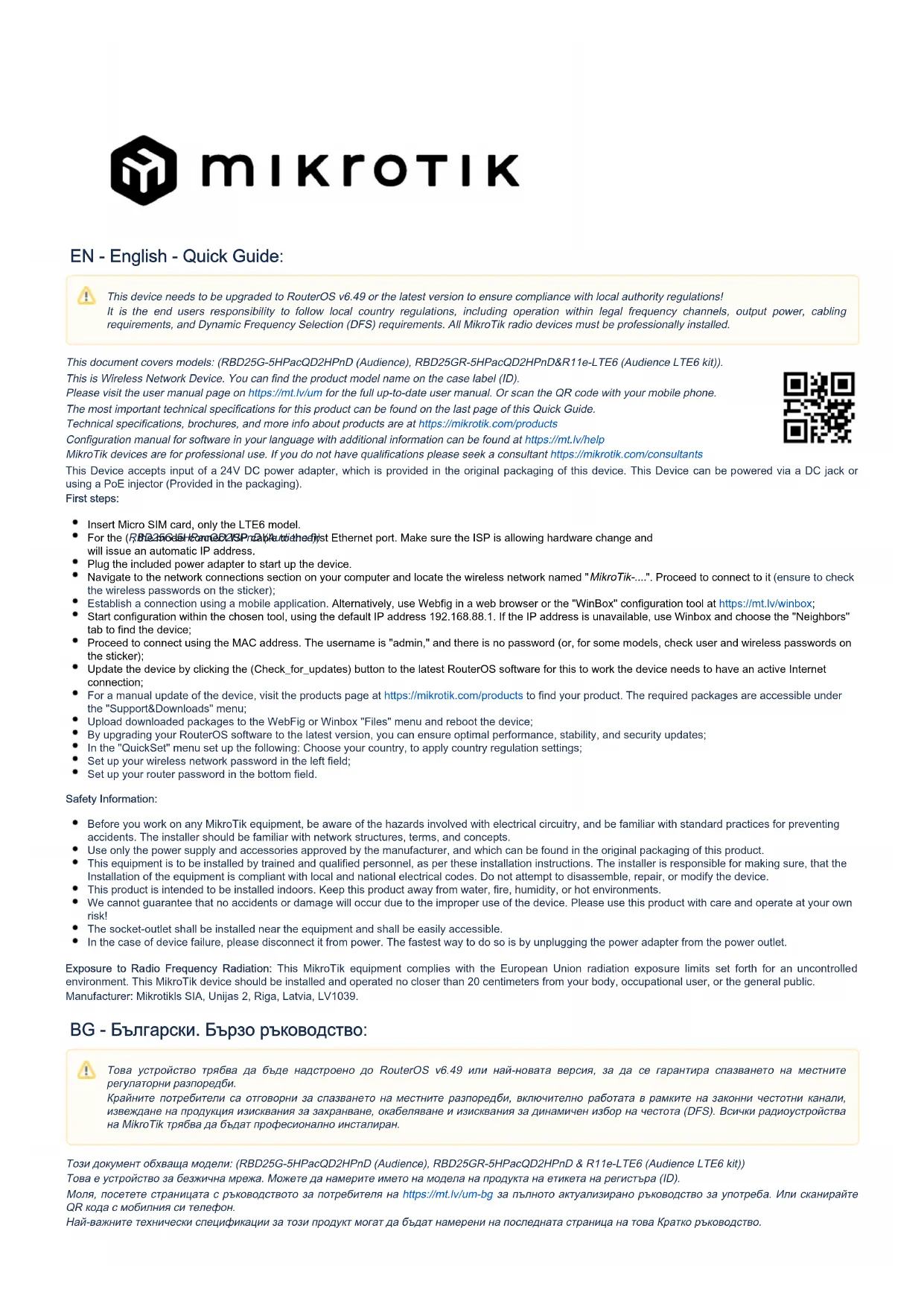 vous de vérifier les mots de passe sans fil sur l'autocollant); Établir une connexion à l'aide d'une application mobile. Vous pouvez également utiliser Webfig dans un navigateur Web ou l'outil de configuration "WinBox" à l'adresse ;https://mt.lv/winbox Démarrez la configuration dans l'outil choisi en utilisant l'adresse IP par défaut 192.168.88.1. Si l'adresse IP n'est pas disponible, utilisez Winbox et choisissez l'onglet "Neighbors" pour trouver le périphérique; Procédez à la connexion en utilisant l'adresse MAC. Le nom d'utilisateur est "admin", et il n'y a pas de mot de passe (ou, pour certains modèles, vérifiez les mots de passe utilisateur et sans fil sur l'autocollant); Mettez à jour l'appareil en cliquant sur le bouton (Check_for_updates) du dernier logiciel RouterOS pour que cela fonctionne, l'appareil doit avoir une connexion Internet active; Pour une mise à jour manuelle de l'appareil, visitez la page des produits sur pour trouver votre produit. Les paquets nécessaires https://mikrotik.com/products sont accessibles dans le menu "Support&Downloads"; Téléchargez les paquets téléchargés dans le menu "Files" de WebFig ou Winbox et redémarrez l'appareil; En mettant à jour votre logiciel RouterOS vers la dernière version, vous pouvez garantir des performances optimales, une stabilité et des mises à jour de sécurité; Dans le menu "QuickSet", configurez ce qui suit : Choisissez votre pays pour appliquer les paramètres de régulation du pays; Configurez le mot de passe de votre réseau sans fil dans le champ de gauche; Configurez le mot de passe de votre routeur dans le champ inférieur. Information sur la sécurité: Avant de travailler sur un équipement MikroTik, soyez conscient des dangers liés aux circuits électriques et familiarisez-vous avec les pratiques standard de prévention des accidents.Le programme d'installation doit être familiarisé avec les structures, les termes et les concepts du réseau. Utilisez uniquement l'alimentation et les accessoires approuvés par le fabricant et qui se trouvent dans l'emballage d'origine de ce produit. Cet équipement doit être installé par du personnel formé et qualifié, conformément à ces instructions d'installation.L'installateur est responsable de s'assurer que l'installation de l'équipement est conforme aux codes électriques locaux et nationaux.N'essayez pas de démonter, réparer ou modifier l'appareil. Ce produit est destiné à être installé à l'intérieur.Gardez ce produit loin de l'eau, du feu, de l'humidité ou des environnements chauds. Nous ne pouvons garantir qu'aucun accident ou dommage ne se produira en raison d'une mauvaise utilisation de l'appareil.Veuillez utiliser ce produit avec soin et l'utiliser à vos propres risques! La prise de courant doit être installée à proximité de l'équipement et doit être facilement accessible. En cas de panne de l'appareil, veuillez le déconnecter de l'alimentation.La façon la plus rapide de le faire est de débrancher l'adaptateur secteur de la prise de courant. Exposition aux rayonnements de radiofréquence : cet équipement MikroTik est conforme aux limites d'exposition aux rayonnements de l'Union européenne établies pour un environnement non contrôlé. Cet appareil MikroTik doit être installé et utilisé à moins de 20 centimètres de votre corps, de l'utilisateur professionnel ou du grand public. Fabricant: Mikrotikls SIA, Unijas 2, Riga, Lettonie, LV1039. HR - Hrvatski. Brzi vodič: Cet appareil doit être mis à niveau vers RouterOS v6.49 ou la dernière version pour garantir la conformité aux réglementations des autorités locales. Il est de la responsabilité des utilisateurs finaux de suivre les réglementations locales du pays, y compris le fonctionnement dans les canaux de fréquence légaux, la sortie les exigences d'alimentation, de câblage et de sélection dynamique de fréquence (DFS). Tous les appareils radio MikroTik doivent êtreinstallé professionnellement.Ovaj dokument pokriva modele: (RBD25G-5HPacQD2HPnD (Audience), RBD25GR-5HPacQD2HPnD & R11e-LTE6 (Audience LTE6 kit)) Ovo je bežični mrežni uređaj. Naziv modela proizvoda možete pronaći na naljepnici kućišta (ID). Molimo posjetite stranicu s priručnikom na za cjeloviti ažurirani korisnički priručnik.https://mt.lv/um-hr Ili skenirajte QR kod sa svojim mobilnim telefonom. Najvažnije tehničke specifikacije za ovaj proizvod mogu se naći na posljednjoj stranici ovog Kratkog vodiča. Tehničke specifikacije, brošure i više informacija o proizvodima nahttps://mikrotik.com/products Priručnik o konfiguraciji softvera na vašem jeziku s dodatnim informacijama potražite na https://mt.lv/help-hr MikroTik uređaji su za profesionalnu upotrebu. Ako nemate kvalifikacije, potražite savjetnikahttps://mikrotik.com/consultants Ovaj uređaj prihvaća ulaz 24-strujnog mrežnog adaptera, koji je isporučen u originalnom pakiranju ovog uređaja.Ovaj uređaj se može napajati preko DC priključka ili pomoću PoE injektora (isporučeno u pakiranju). Prvi koraci: Umetnite Micro SIM karticu, samo model LTE6. Za model ( , model spojite ISP kabel na prvi Ethernet priključak. RBD25G-5HPacQD2HPnD (Audience)) Provjerite omogućuje li ISP mogućnost promjene hardvera i izdaje automatsku IP adresu. Uključite uključeni adapter za napajanje da biste pokrenuli uređaj. Dođite do odjeljka mrežnih veza na računalu i pronađite bežičnu mrežu pod nazivom " ". Nastavite s povezivanjem s njim(obavezno provjerite MikroTik-....