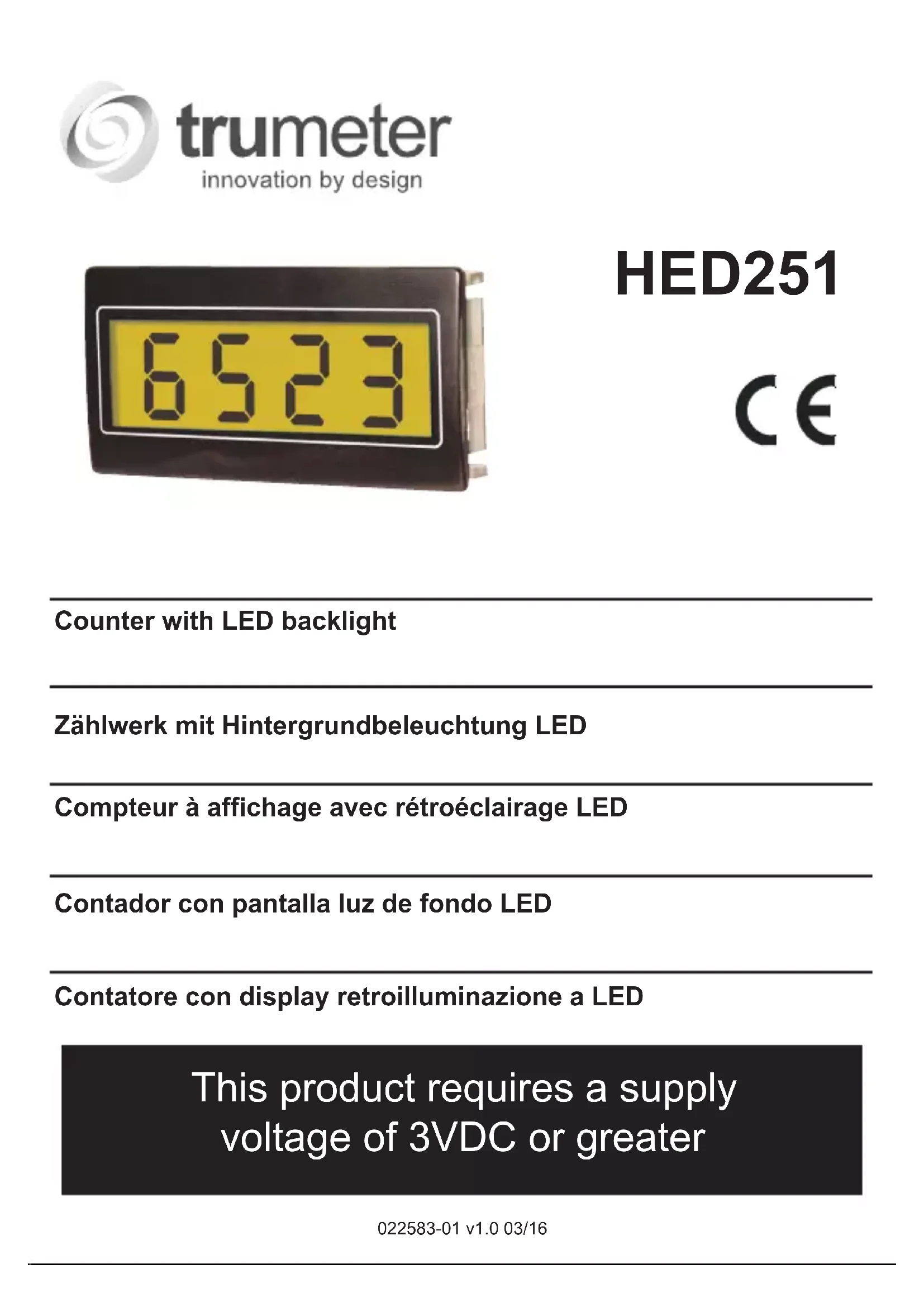 HED251 Counter with LED backlight Zählwerk mit Hintergrundbeleuchtung LED Compteur à affichage avec rétroéclairage LED Contador con pantalla luz de fondo LED Contatore con display retroilluminazione a LED This product requires a supply voltage of 3VDC or greater 022583-01 v1.0 03/16Remarque: Ce produit est idéal pour les applications alimentées par batteries. Dans le cas où ce produit serait susceptible d'être inclus dans un circuit utilisant une source d'alimentation externe, l'intégralité du système devra alors recevoir l'agrément des normes CE. La longueur de tout câble mesure (signal) raccordé à cet appareil ne doit pas excéder 30 mètres. Si les câbles « mesure » passent à l'extérieur du bâtiment, il est nécessaire d'installer des dispositifs additionnels de protections de surtensions.