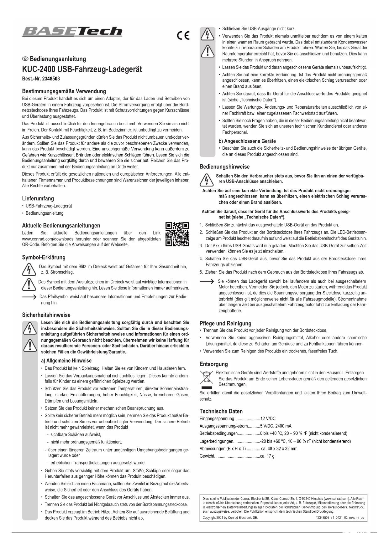 - Nettoyez le produit à l'aide d'un chiffon sec et sans bres. Élimination des déchets Les appareils électroniques sont des matériaux recyclables et ne doivent pas être éliminés avec les ordures ménagères. En n de vie, éliminez l’appareil conformé- ment aux dispositions légales en vigueur. Ainsi, vous respectez les ordonnances légales et contribuez à la protection de l’environnement. Caractéristiques techniques Tension d’entrée ........................... 12 V/CC Tension/courant de sortie ............. 5 V/CC, 2400 mA Conditions de fonctionnement ...... 0 à +40 °C, 20 à 90 % HR (sans condensation) Conditions de stockage ................ -20 à +60 ºC, 10 à 90 % HR (sans condensation) Dimensions (l x h x p) ................... env. 48 x 32 x 32 mm Poids ............................................. env. 17 g Mode d’emploi Adaptateur allume-cigare avec port USB KUC-2400 N° de commande 2348503 Utilisation prévue Ce produit est conçu pour charger et faire fonctionner les périphériques USB d'un véhicule. L’alimentation électrique est assurée par une prise électrique embarquée. Le produit est doté de mécanismes de protection contre les surcharges et les courts-circuits. Il est uniquement destiné à une utilisation à l’intérieur. Ne l'utilisez pas à l’extérieur. Tout contact avec l'humidité, par ex. dans les salles de bains, doit être évité en toutes circonstances. Pour des raisons de sécurité et d’homologation, toute restructuration et/ou modication du produit est interdite. Toute utilisation à des ns autres que celles décrites ci-dessus pourrait en- dommager le produit. De plus, une mauvaise utilisation pourrait entraîner des risques tels que les courts-circuits, les incendies, les chocs électriques, etc. Lisez attentivement les instructions du mode d’emploi et conservez-le dans un endroit sûr. Ne mettez ce produit à la disposition de tiers qu’avec son mode d’emploi. Ce produit est conforme aux exigences nationales et européennes en vigueur. Tous les noms d’entreprises et appellations de produits sont des marques commerciales de leurs propriétaires respectifs. Tous droits réservés. Contenu de l’emballage