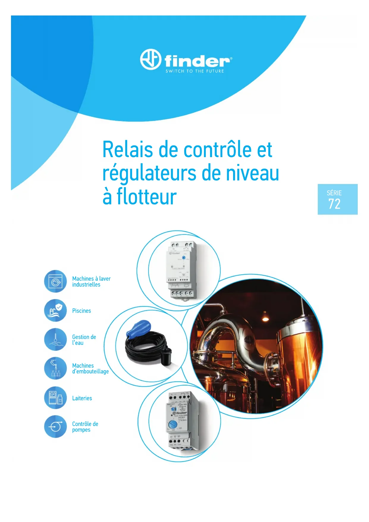 Relais de contrôle et régulateurs de niveau à flotteur Piscines Gestion de l’eau Machines d’embouteillage Laiteries Contrôle de pompes Machines à laver industriellesLes prix, les caractéristiques et les disponibilités de nos produits et services peuvent changer sans préavis. FINDER décline toute responsabilité quant à la présence éventuelle d’erreurs ou d’informations insuffisantes dans ce document. En cas de divergence entre les versions imprimées et en ligne, cette dernière prévaut.E Relais de contrôle de niveaux pour liquides conducteursType 72.01 - Sensibilité réglable - Disponible avec alimentation 400V - Disponible avec sensibilité réglable (5...450) kΩ - Disponible aussi pour la commutation de faibles charges jusqu'à 5V 1mAType 72.11 - Sensibilité fixe