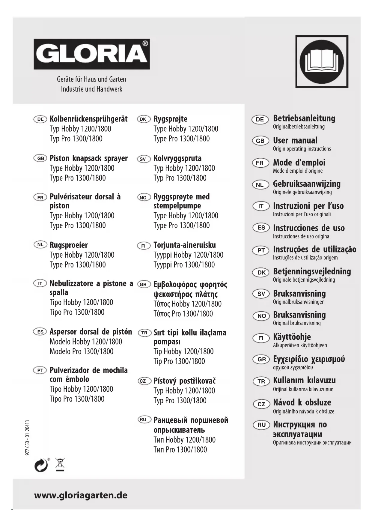 9 Accessoire Buse à jet plat : Référence 111.0000 Ecran de pulvérisation type 260 : Référence 260.0000 Ecran de pulvérisation type 270 : Référence 270.0000 Tube de rallonge laiton 0,5 m : Référence 124.0000 Tube de rallonge laiton 1,0 m : Référence 110.0000 Nettoyant pour pulvérisateurs : Référence 1100.0000 Vous trouverez d'autres accessoires sur le site www.gloriagarten.de 10 Elimination des déchets & législation