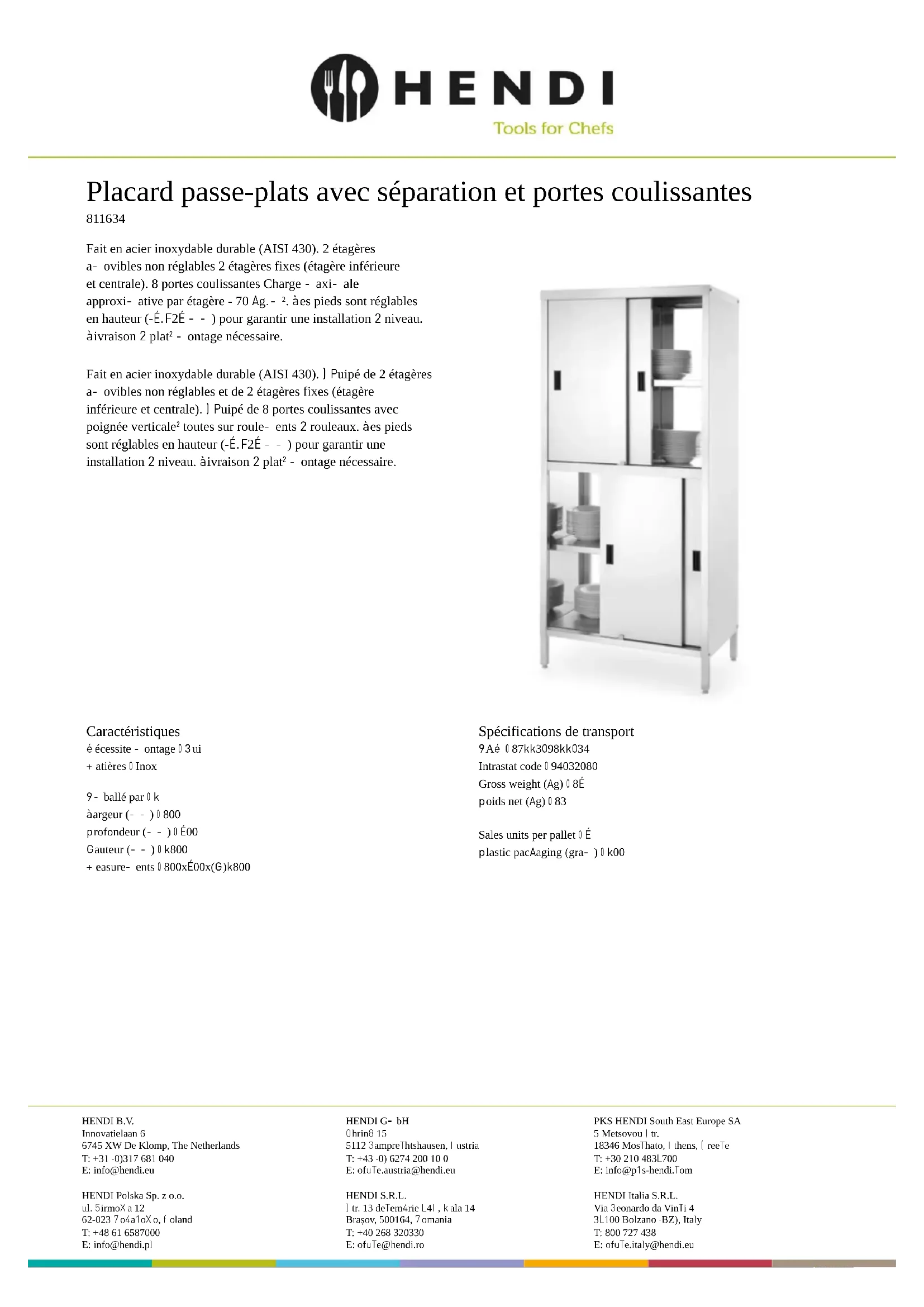 Fait en acier inoxydable durable (AISI 430). 2 étagères amovibles non réglables 2 étagères fixes (étagère inférieure et centrale). 8 portes coulissantes Charge maximale approximative par étagère - 70 kg/m². Les pieds sont réglables en hauteur (-5/+25 mm) pour garantir une installation à niveau. Livraison à plat, montage nécessaire. Fait en acier inoxydable durable (AISI 430). Équipé de 2 étagères amovibles non réglables et de 2 étagères fixes (étagère inférieure et centrale). Équipé de 8 portes coulissantes avec poignée verticale, toutes sur roulements à rouleaux. Les pieds sont réglables en hauteur (-5/+25 mm) pour garantir une installation à niveau. Livraison à plat, montage nécessaire. Caractéristiques Nécessite montage : Oui Matières : Inox Emballé par : 1 Largeur (mm) : 800 Profondeur (mm) : 500 Hauteur (mm) : 1800 Measurements : 800x500x(H)1800 Spécifications de transport EAN : 8711369811634 Intrastat code : 94032080 Gross weight (kg) : 85 Poids net (kg) : 83 Sales units per pallet : 5 Plastic packaging (gram) : 100 HENDI B.V. Innovatielaan 6 6745 XW De Klomp, The Netherlands T: +31 (0)317 681 040 E: info@hendi.eu HENDI GmbH Ehring 15 5112 Lamprechtshausen, Austria T: +43 (0) 6274 200 10 0 E: office.austria@hendi.eu PKS HENDI South East Europe SA 5 Metsovou Str. 18346 Moschato, Athens, Greece T: +30 210 4839700 E: info@pks-hendi.com HENDI Polska Sp. z o.o. ul. Firmowa 12 62-023 Robakowo, Poland T: +48 61 6587000 E: info@hendi.pl HENDI S.R.L. Str. 13 decembrie 94A, Hala 14 Brașov, 500164, Romania T: +40 268 320330 E: office@hendi.ro HENDI Italia S.R.L. Via Leonardo da Vinci 4 39100 Bolzano (BZ), Italy T: 800 727 438 E: office.italy@hendi.eu