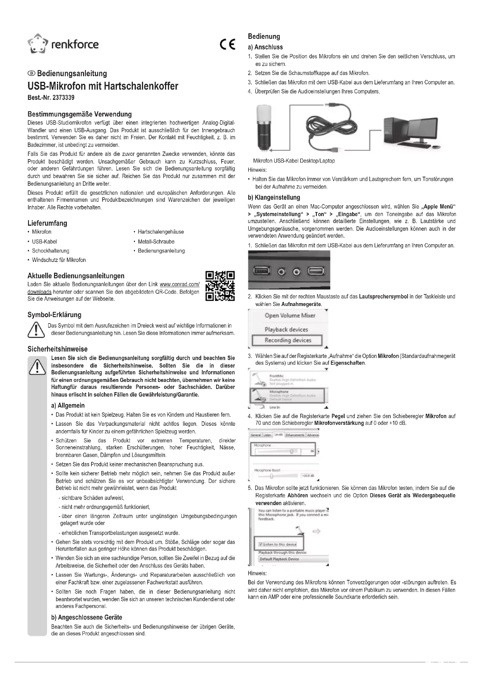 passant à l’onglet Listen (écouter) et en activant l’option Listen to this device (écoute de ce périphérique). Remarque : Des retards ou des perturbations sonores peuvent se produire lorsque vous utilisez le microphone. Il n’est donc pas recommandé d’utiliser le microphone devant un public. Dans ces scénarios, une AMP ou une carte son professionnelle peut être nécessaire. Mode d’emploi Microphone USB avec étui rigide N° de commande 2373339 Utilisation prévue Ce microphone USB de studio dispose d’un convertisseur analogique-numérique intégré de haute qualité et une sortie USB. Il est uniquement destiné pour une utilisation à l’intérieur. Ne l'utilisez pas à l’extérieur. Tout contact avec l'humidité, par ex. dans les salles de bains, doit être évité en toutes circonstances. Pour des raisons de sécurité et d’homologation, toute reconstitution et/ou modication de ce produit est interdite. Toute utilisation à des ns autres que celles décrites pourrait endommager le produit. De plus, une utilisation inappropriée pourrait entraîner des courts-circuits, des incendies ou d’autres risques. Lisez attentivement le mode d’emploi et conservez-le dans un endroit sûr. Si vous devez fournir ce produit à des tiers, veillez à y joindre le mode d’emploi. Ce produit est conforme aux exigences nationales et européennes en vigueur. Tous les noms d’entreprises et appellations de produits sont des marques commerciales de leurs propriétaires respectifs. Tous droits réservés. Contenu de l’emballage