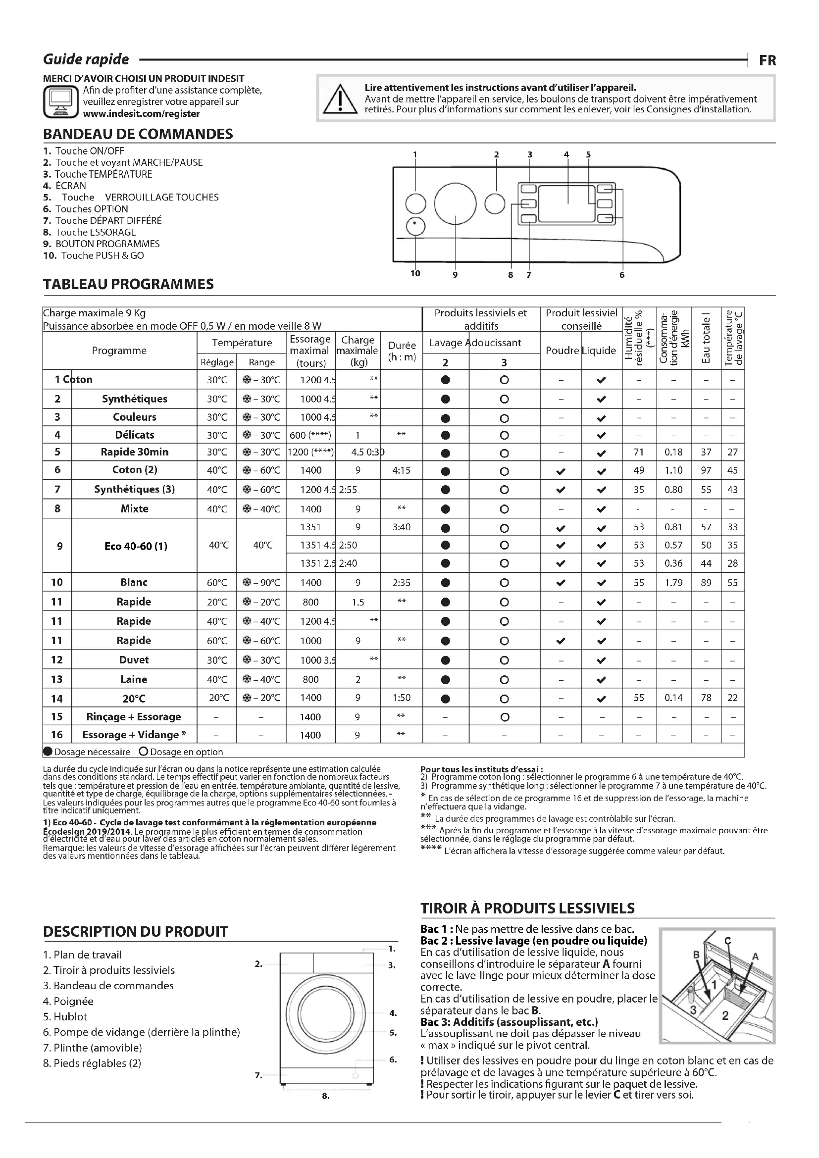 Retrouvez gratuitement la notice de l'appareil BWE91496XWVFR INDESIT au format PDF.