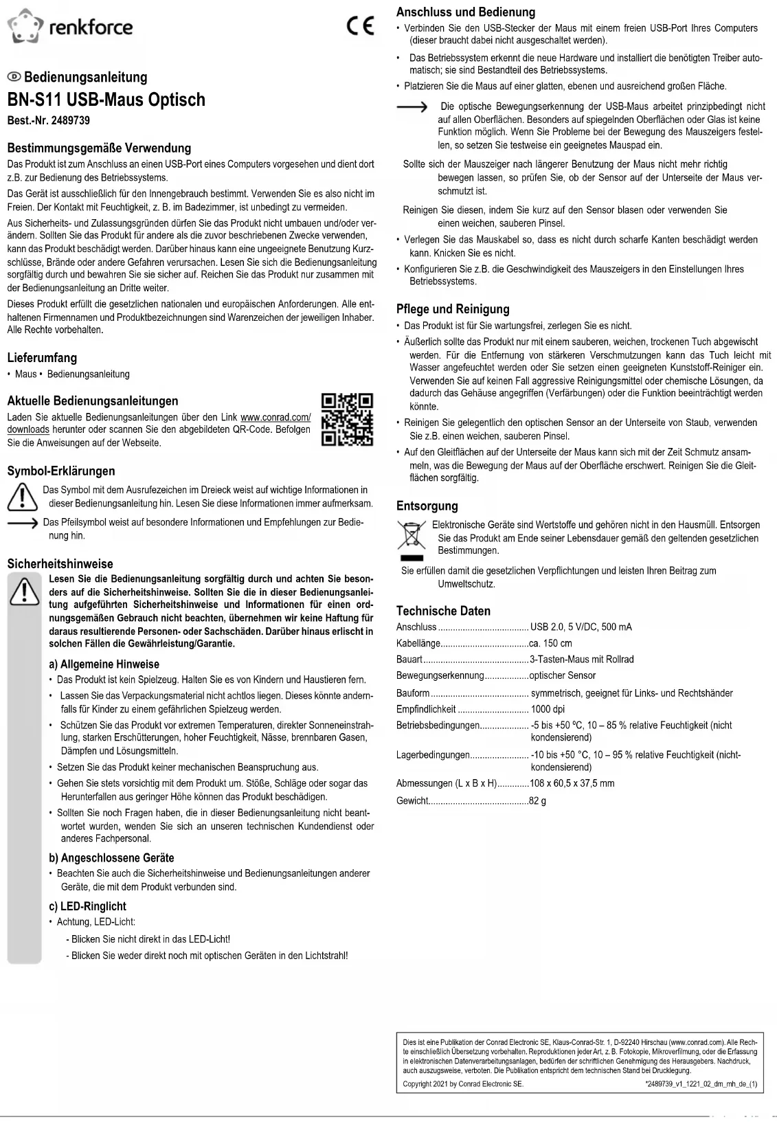 - Sur les surfaces de glissement, sur le dessous de la souris, de la saleté peut s’accumuler au cours du temps, ce qui complique le déplacement de la souris sur la surface. Nettoyez soigneusement les surfaces de glissement. Élimination des déchets Les appareils électroniques sont des matériaux recyclables et ne doivent pas être éliminés avec les ordures ménagères. En n de vie, éliminez l’appareil conformé- ment aux dispositions légales en vigueur. Ainsi, vous respectez les ordonnances légales et contribuez à la protection de l’en- vironnement. Caractéristiques techniques Connexion .................................... USB 2.0, 5 V/DC, 500 mA Longueur du câble ........................ env. 150 cm Type de fabrication ....................... souris à 3 boutons avec molette de délement Détection de mouvement .............. capteur optique Structure ....................................... symétrique, convenant pour droitier et gaucher Résolution ..................................... 1000 dpi Conditions de fonctionnement ...... -5 à 50 °C, 10 - 85 % d'humidité relative (sans condensa- tion) Conditions de stockage ................ -10 à +50 °C, 10 - 95 % d'humidité relative (sans conden- sation) Dimensions (L x l x H)................... 108 x 60,5 x 37,5 mm Poids ............................................. 82 g Mode d’emploi Souris optique USB « BN-S11 » N° de commande 2489739 Utilisation prévue Le produit est conçu pour être connecté à un port USB d‘un ordinateur et sert ici p. ex. de commande du système d‘exploitation. Il est uniquement destiné à une utilisation à l’intérieur. Ne l'utilisez pas à l’extérieur. Tout contact avec l'humidité, par ex. dans les salles de bains, doit être évité en toutes circonstances. Pour des raisons de sécurité et d’homologation, toute restructuration et/ou modication du produit est interdite. Toute utilisation à des ns autres que celles décrites ci-dessus pourrait endommager le produit. De plus, une mauvaise utilisation pourrait entraîner des risques tels que courts-circuits, incendies et autres dangers. Lisez attentivement les instructions du mode d’emploi et conservez-le dans un endroit sûr. Ne mettez ce produit à la disposition de tiers qu’avec son mode d’emploi. Ce produit est conforme aux exigences nationales et européennes en vigueur. Tous les noms d’entreprises et appellations de produits sont des marques commerciales de leurs propriétaires respectifs. Tous droits réservés. Contenu de l’emballage
