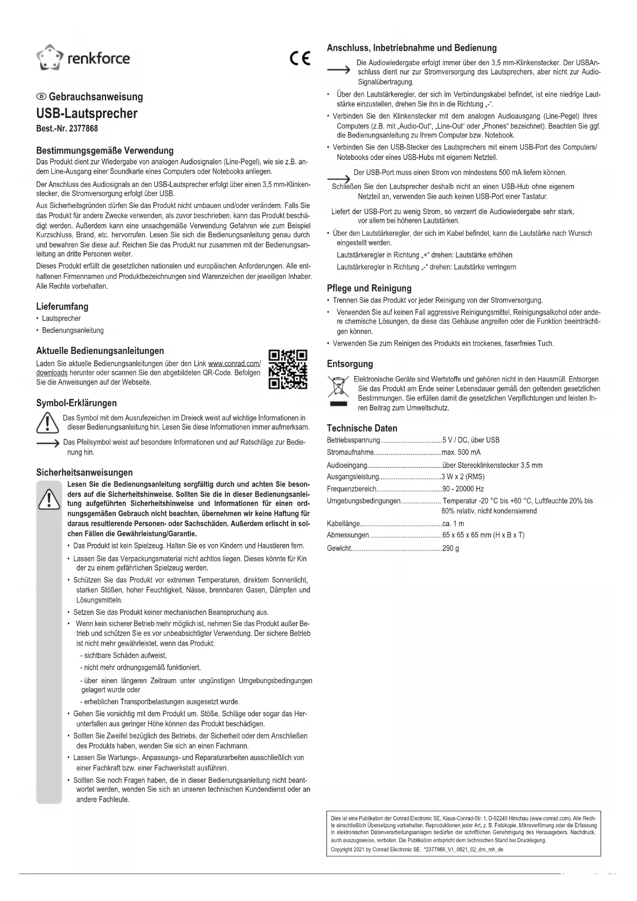 - Nettoyez le produit à l’aide d’un chiffon sec non pelucheux. Recyclage Les appareils électroniques sont des matériaux recyclables et ne doivent pas être éliminés avec les ordures ménagères. En n de vie, éliminez l’appareil conformé- ment aux dispositions légales en vigueur. Vous respectez ainsi les ordonnances légales et contribuez à la protection de l’environnement. Caractéristiques techniques Tension de fonctionnement....................5 V / CC via USB Puissance absorbée..............................max. 500 mA Entrée audio..........................................via che jack stéréo 3,5 mm Puissance de sortie...............................3 W x 2 (RMS) Plage de fréquence...............................90 - 20000 Hz Conditions ambiantes............................ température de -20 °C à +60 °C ; humidité relative de l‘air : 20% à 80% sans condensation Longueur de câble.................................environ 1 m Dimensions............................................65 x 65 x 65 mm (H x L x P) Poids......................................................290 g Mode d’emploi Haut-parleur USB N° de commande 2377868 Utilisation prévue Le produit est prévu pour la reproduction de signaux audio analogiques (niveau de ligne) comme ils arrivent par ex. à la sortie ligne d‘une carte son d‘un PC ou d‘un ordinateur portable. La connexion du signal audio au haut-parleur USB a lieu via une che jack de 3,5 mm, l‘alimen- tation électrique a lieu via USB. Pour des raisons de sécurité, vous ne devez pas modier et/ou transformer le produit. Si le produit est utilisé à d‘autres ns que celles décrites ci-dessus, il peut être endommagé. En outre, une utilisation incorrecte peut générer des risques, comme par exemple, un court-cir- cuit, un incendie, une électrocution, etc. Lisez attentivement le mode d‘emploi et conservez-le. Transmettez toujours le mode d‘emploi du produit si vous le donnez à des tiers. Ce produit est conforme aux exigences nationales et européennes en vigueur. Tous les noms d’entreprises et appellations de produits sont des marques commerciales de leurs propriétaires respectifs. Tous droits réservés. Contenu d’emballage