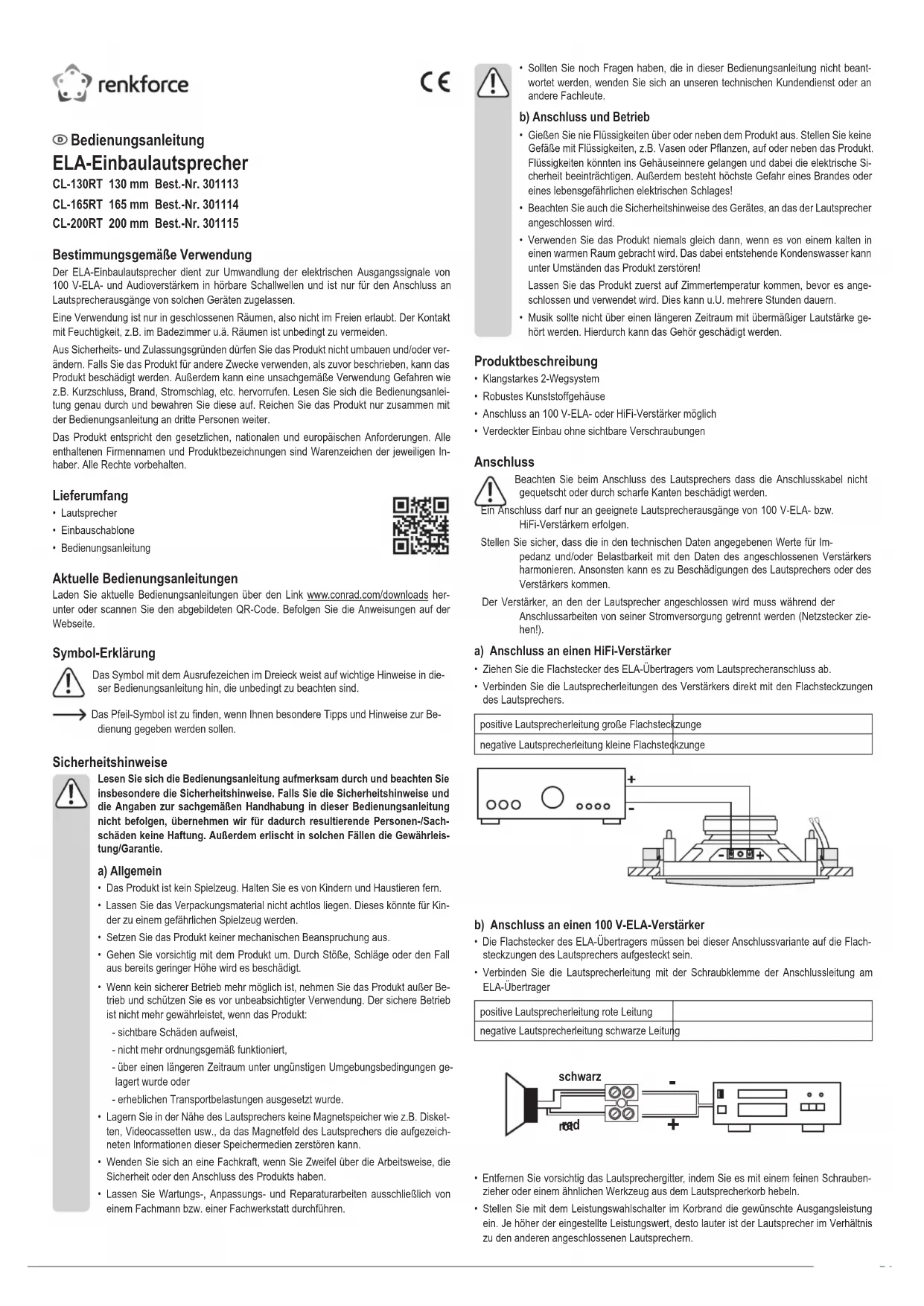 - Press the grille back into place on the speaker. Care and cleaning Do not use abrasive cleaning agents, cleaning alcohol or other chemical solutions since these could damage the housing or even impair operation. Use a dry, lint-free cloth to clean the product. Disposal Electronic devices are recyclable material and do not belong in the household waste. Please dispose of the product, when it is no longer of use, according to the current statutory requirements. Technical data Model CL-130RT CL-165RT CL-200RT Impedance in hi- mode 8 ohms Load capacity in hi- mode 20/45 W 30/80 W 45/120 W Power stages in 100 V ELA mode 1/2/4/8/15 W Impedance in 100 V ELA mode 10 k / 5 k / 2.5 k / 1.25 k / 667 ohms Frequency range 50-21000 Hz 40-21000 Hz 30-21000 Hz Sound pressure 86 dB/1 W/1 m 87 dB/1 W/1 m 87 dB/1 W/1 m Mounting diameter 167 mm 180 mm 222 mm Mounting depth 71 mm 71 mm 93 mm Strength of the mounting surface 9-25 mm 9-25 mm 9-25 mm• Si vous avez encore des questions auxquelles il n‘y a pas de réponse dans ce mode d‘emploi, adressez-vous à notre service technique d‘après-vente ou à d‘autres spécialistes.b) Branchement et mise en service• Ne renversez jamais de liquides sur ou à côté de ce produit. Ne posez aucun récipient rempli de liquides, p. ex. des vases ou des plantes, sur ou à côté du produit. Les liquides risqueraient de pénétrer dans le boîtier et de compromettre la sécurité électrique. Par ailleurs, il existe un extrême danger d‘incendie ou de choc électrique avec danger de mort !• Tenez également compte des consignes de sécurité et des modes d‘emploi du téléphone auquel cet appareil sera raccordé.• N’utilisez jamais l’appareil lorsqu’il vient d’être transporté d’un local froid vers un local chaud. L’eau de condensation qui en résulte pourrait le cas échéant détruire le produit !Laissez d’abord le produit prendre la température ambiante, avant de le connecter et de l’utiliser. Cela peut éventuellement durer plusieurs heures.• Il est déconseillé d‘écouter de la musique de manière prolongée à un volume sonore excessif. Cela peut entraîner des troubles auditifs. Description de l‘appareil
