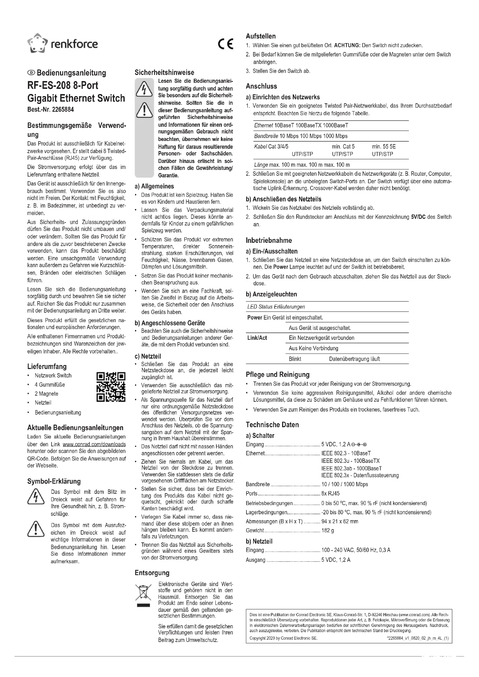 - Nettoyez le produit avec un chiffon sec et sans bres. Caractéristiques techniques a) Commutateur Entrée ........................................... 5 V/DC, 1,2 A Ethernet ........................................ IEEE 802.3 - 10BaseT IEEE 802.3u - 100BaseTX IEEE 802.3ab - 1000BaseT IEEE 802.3x - Flow Control Bande passante ............................ 10 / 100 / 1000 Mbps Ports ............................................. 8x RJ45 Conditions de fonctionnement ...... de 0 à +50 °C, max. 90 % HR (sans condensation) Conditions de stockage ................ -20 à +80 °C, max. 90 % HR (sans condensation) Dimensions (l x H x P) .................. 94 x 21 x 62 mm Poids ............................................. 182 g b) Adaptateur secteur Entrée ........................................... 100 - 240 V/CA, 50/60 Hz, 0,3 A Sortie ............................................ 5 V/CC, 1,2 A Mode d’emploi Commutateur Ethernet Gigabit 8 ports RF-ES-208 Nº de commande 2265884 Utilisation prévue Le produit est prévu pour un réseau câblé. 8 connexions à paire torsadée (RJ45) sont disponibles. L’alimentation est assurée par un adaptateur secteur. Il est uniquement destiné à une utilisation en intérieur. Ne l’utilisez pas en extérieur. Tout contact avec l’humidité, p. ex. dans les salles de bains, doit être évité en toutes cir- constances. Pour des raisons de sécurité et d’homologation, toute restructuration et/ ou modication du produit est interdite. Toute utilisation à des ns autres que celles décrites ci-dessus pourrait endommager le produit. De plus, une mauvaise utilisation pourrait entraîner des risques tels que les courts-circuits, les incendies, les chocs élec- triques, etc. Lisez attentivement les instructions du mode d’emploi et conservez-le dans un endroit sûr. Ne mettez ce produit à la disposition de tiers qu’avec le mode d’emploi correspondant. Ce produit est conforme aux exigences na- tionales et européennes en vigueur. Tous les noms d’entreprises et appellations de produits sont des marques commerciales de leurs propriétaires respectifs. Tous droits réservés. Contenu de l’emballage