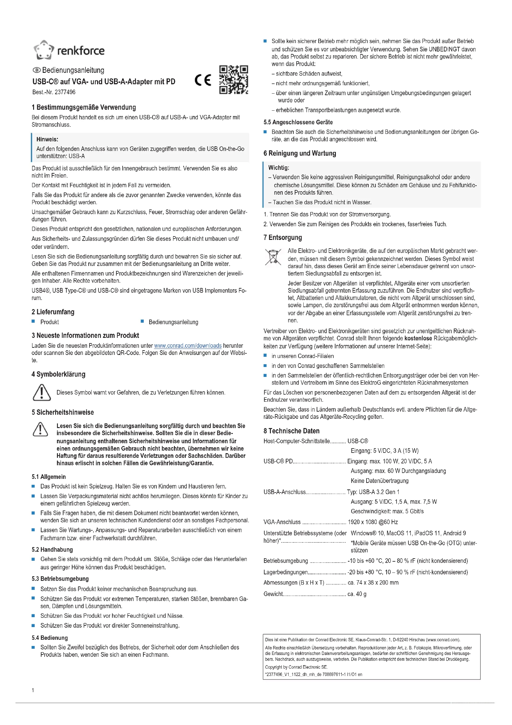 dans les points de collecte des organismes de droit public chargés de l'élimination des déchets ou auprès des systèmes de reprise mis en place par les fabricants et les distri- buteurs au sens de la loi sur les équipements électriques et électroniques (ElektroG) L'utilisateur final est responsable de l'effacement des données personnelles sur l'équipe- ment usagé à mettre au rebut. Veuillez noter que dans les pays autres que l'Allemagne, d'autres obligations peuvent s'ap- pliquer pour la remise et le recyclage des appareils usagés. 8 Caractéristiques techniques Interface d’ordinateur hôte.............. USB-C® Entrée: 5V/CC, 3A (15W) USB-C® PD.................................... Entrée: 100W max., 20V/CC, 5A Sortie: charge directe de 60W max. Aucun transfert de données Port USB-A..................................... Type: USB-A 3.2 Gen 1 Sortie: 5V/CC, 1,5A, 7,5W max. Vitesse: 5Gbit/s max. Port VGA ........................................ 1920x1080 @60 Hz Systèmes d’exploitation pris en charge (ou versions supérieures)*.. Windows®10, MacOS11, iPadOS11, Android9 *Les appareils mobiles doivent prendre en charge la fonctionnalitéUSBOn-the-Go (OTG) Conditions de fonctionnement........ -10 à +60°C, 20 à 80% HR (sans condensation) Conditions de stockage .................. -20 à +80°C, 10 à 90% HR (sans condensation) Dimensions (LxHxP)................... env. 74x38x200mm Poids............................................... env. 40 g Ceci est une publication de Conrad Electronic SE, Klaus-Conrad-Str. 1, D-92240 Hirschau (www.conrad.com). Tous droits réservés, y compris de traduction. Toute reproduction, quelle qu‘elle soit (p. ex. photocopie, microfilm, saisie dans des installations de traitement de données) nécessite une autorisation écrite de l‘éditeur. Il est interdit de le réimpri- mer, même par extraits. Cette publication correspond au niveau technique du moment de la mise sous presse. Copyright by Conrad Electronic SE. *2377496_V1_1122_dh_mh_fr 708697611-3 I1/O1 en4 Gebruiksaanwijzing USB-C® naar VGA en USB-A-adapter met stroomlevering Bestelnr.: 2377496 1 Beoogd gebruik Dit product is een USB-C® naar USB-A en VGA-adapter met stroomlevering. Opmerking: D volgende poort is toegankelijk voor apparaten die USB On-the-Go ondersteunen: USB-
