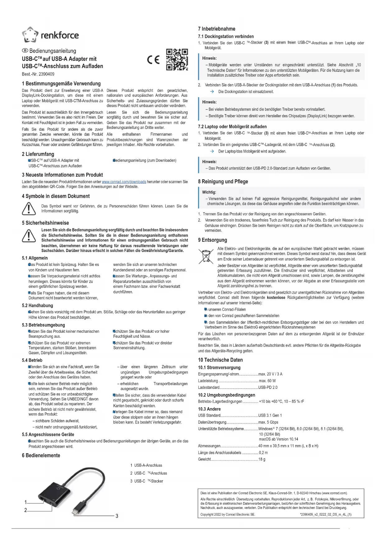 pour la charge N° de commande 2390409 1 Utilisation prévue Le produit sert à étendre une station d'accueil USB-A DisplayLink pour l'utiliser avec un ordinateur portable ou un appareil mobile avec port USB-CTM. L’appareil est destiné à un usage intérieur uniquement. N’utilisez donc pas l'appareil en plein air. Évitez dans tous les cas tout contact avec l’humidité. Si vous utilisez le produit à des ns autres que celles décrites précédemment, vous risquez de l’endommager. Une utilisation inappropriée peut entraîner un court-circuit, un incendie ou d'autres dangers. Ce produit est conforme aux exigences des normes européennes et nationales en vigueur. Pour des raisons de sécurité et d’homologation, toute transformation et/ou modication du produit est interdite. Lisez attentivement le mode d’emploi et conservez- le dans un endroit sûr. Transmettez toujours le mode d'emploi avec le produit, si vous le donnez à un tiers. Tous les noms d’entreprises et appellations de produits contenus dans ce mode d’emploi sont des marques déposées de leurs propriétaires respectifs. Tous droits réservés. 2 Contenu d’emballage