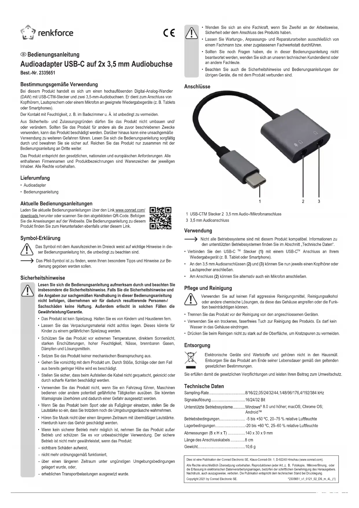 Chrome OS ; Android™ Conditions de service ............................ De -5 à +50 ºC, 20-75 % d’humidité relative Conditions de stockage .........................De -20 à +60 ºC, 25 - 60 % d’humidité relative Dimensions (L x H x P) ..........................140 x 30 x 9 mm Longueur du câble de raccordement .....8 cm Poids ......................................................10,6 g Mode d’emploi Adaptateur USB-C vers 2x prise audio 3,5 mm N° de commande 2335651 Utilisation prévue Ce produit est un convertisseur numérique-analogique haute résolution (DAW) avec che USB-CTM et deux prises audio de 3,5 mm. Il sert à connecter des écouteurs, des haut-parleurs ou un microphone à des appareils de lecture appropriés (par exemple des tablettes ou des smartphones). Le contact avec l'humidité, par ex. dans une salle de bains, etc. doit être absolument évité. Pour des raisons de sécurité et d’homologation, toute transformation et/ou modication du produit est interdite. Toute utilisation à des ns autres que celles décrites ci-dessus pourrait endommager le produit. En outre, une utilisation incorrecte peut entraîner d'autres dangers. Lisez attentivement le mode d’emploi et conservez-le dans un endroit sûr. Ne remettez le produit à un tiers qu’accompagné de son mode d’emploi. Le produit est conforme aux exigences légales, européennes et nationales en vigueur. Tous les noms d’entreprises et appellations de produits contenus dans ce mode d’emploi sont des marques déposées de leurs propriétaires respectifs. Tous droits réservés. Contenu d’emballage