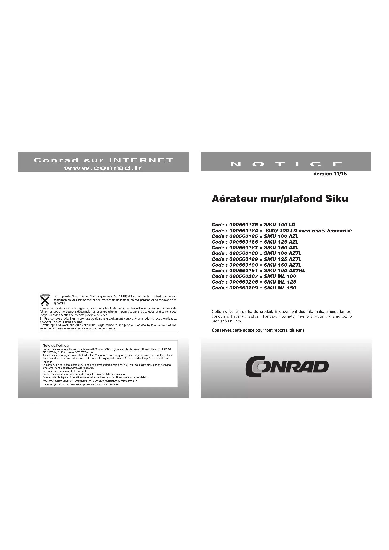 Aérateur mur/plafond Siku Code : 000560179 = SIKU 100 LD Code : 000560184 = SIKU 100 LD avec relais temporisé Code : 000560185 = SIKU 100 AZL Code : 000560186 = SIKU 125 AZL Code : 000560187 = SIKU 150 AZL Code : 000560188 = SIKU 100 AZTL Code : 000560189 = SIKU 125 AZTL Code : 000560190 = SIKU 150 AZTL Code : 000560191 = SIKU 100 AZTHL Code : 000560207 = SIKU ML 100 Code : 000560208 = SIKU ML 125 Code : 000560209 = SIKU ML 150 Cette notice fait partie du produit. Elle contient des informations importantes concernant son utilisation. Tenez-en compte, même si vous transmettez le produit à un tiers. Conservez cette notice pour tout report ultérieur ! NOTICE Conrad sur INTERNET www.conrad.fr Version 11/15 Les appareils électriques et électroniques usagés (DEEE) doivent être traités individuellement et conformément aux lois en vigueur en matière de traitement, de récupération et de recyclage des appareils.Suite à l’application de cette réglementation dans les Etats membres, les utilisateurs résidant au sein de l’Union européenne peuvent désormais ramener gratuitement leurs appareils électriques et électroniques usagés dans les centres de collecte prévus à cet effet.En France, votre détaillant reprendra également gratuitement votre ancien produit si vous envisagez d’acheter un produit neuf similaire.Si votre appareil électrique ou électronique usagé comporte des piles ou des accumulateurs, veuillez les retirer de l’appareil et les déposer dans un centre de collecte.Note de l’éditeurCette notice est une publication de la société Conrad, ZAC Englos les Géants Lieu-dit Rue du Hem, TSA 72001 SEQUEDIN, 59458 Lomme CEDEX/France.Tous droits réservés, y compris la traduction. Toute reproduction, quel que soit le type (p.ex. photocopies, micro-films ou saisie dans des traitements de texte électronique) est soumise à une autorisation préalable écrite de l’éditeur.Le contenu de ce mode d'emploi peut ne pas correspondre fidèlement aux intitulés exacts mentionnés dans les différents menus et paramètres de l'appareil.Reproduction, même partielle, interdite.Cette notice est conforme à l’état du produit au moment de l’impression.Données techniques et conditionnement soumis à modifications sans avis préalable.Pour tout renseignement, contactez notre service technique au 0892 897 777 © Copyright 2014 par Conrad. Imprimé en CEE. XXX/11-15/JV2 3 Domaine d’utilisation Les ventilateurs aspirants de type SIKU 100/120/150 sont conçus pour aider la ventilation verticale des pièces, qui disposent d’une cheminée de ventilation individuelle. Le petit diamètre du conduit de ventilation s’élève à 100/120/150 mm. Le ventilateur est équipé d’un petit moteur silencieux, fabriqué à partir de plastique ABS de grande qualité. Il fait disparaître en très peu de temps les odeurs, fumées et humidité désagréables. Données techniques Tension nominale Puissance consommée Débit d’air Isolation (pas de mise à zéro) Mode de fonctionnement SIKU 100 AZ 220 à 240 V 20 W 98 m