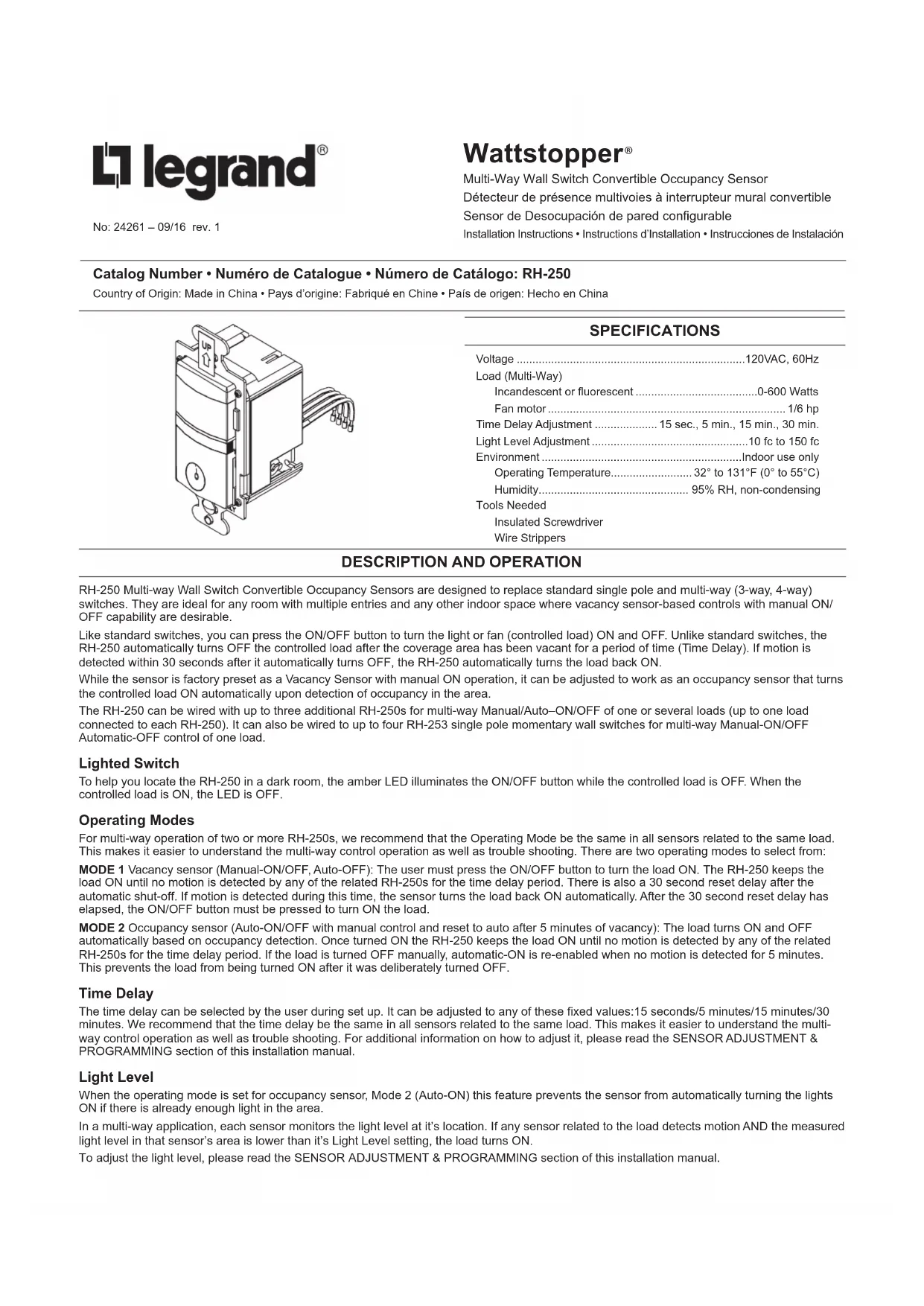 Les détecteurs de présence à interrupteur mural convertible multivoies RH-250 sont conçus pour remplacer les interrupteurs standard unipolaires et multivoies (3 voies, 4 voies). Ils sont idéaux pour toute pièce avec plusieurs entrées et autres espaces intérieurs où des contrôles de présence basés sur des détecteurs avec capacités de marche/arrêt manuelles sont souhaitables. Comme pour les interrupteurs standard, vous pouvez appuyer sur le bouton marche/arrêt pour allumer ou éteindre la lumière ou le ventilateur (charge contrôlée). Contrairement à un interrupteur standard, le RH-250 éteint automatiquement les appareils lorsque sa zone de couverture est demeurée inoccupée pendant un certain temps (délai de temporisation). Si le RH-250 détecte un mouvement dans les 30 secondes après s’être éteint automatiquement, la lumière se rallume automatiquement. Lorsque le détecteur est réglé par défaut comme détecteur d’inoccupation