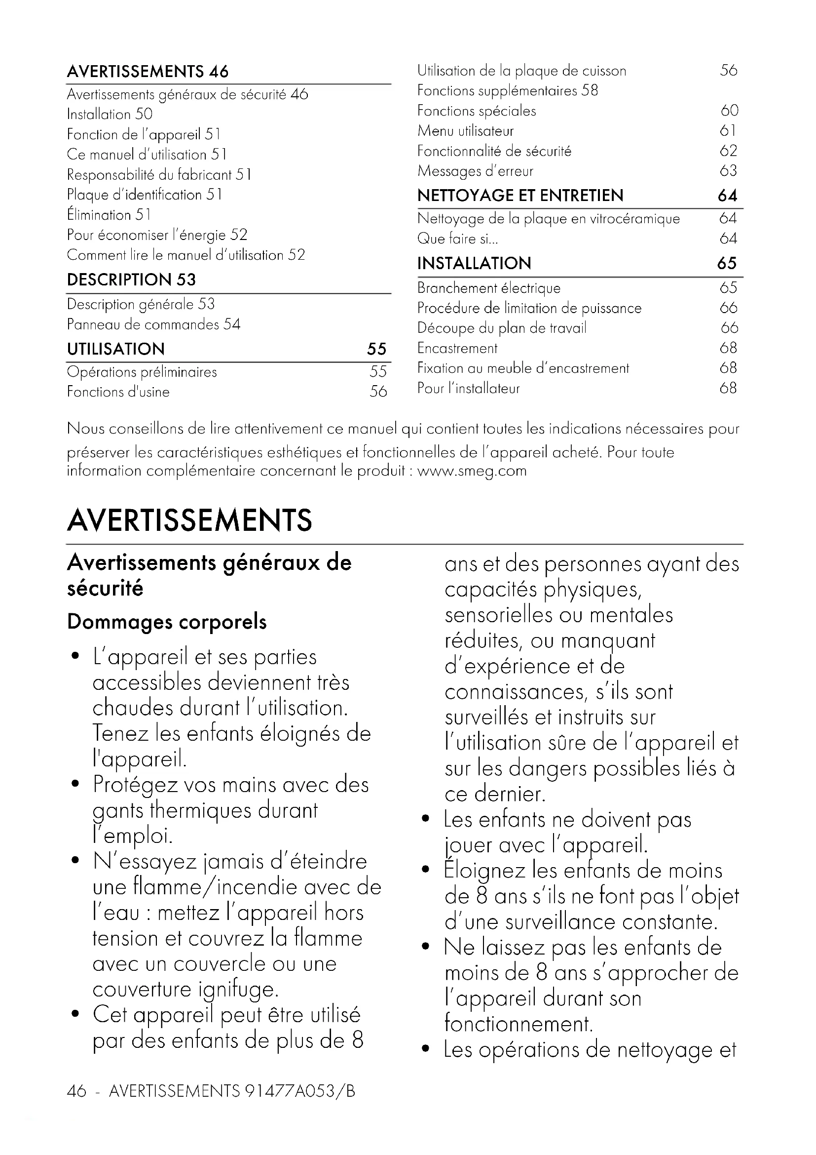 Nettoyage de la plaque en vitrocéramique 64 Que faire si... 64 INSTALLATION 65 Branchement électrique 65 Procédure de limitation de puissance 66 Découpe du plan de travail 66 Encastrement 68 Fixation au meuble d’encastrement 68 Pour l’installateur 68 Nous conseillons de lire attentivement ce manuel qui contient toutes les indications nécessaires pour préserver les caractéristiques esthétiques et fonctionnelles de l’appareil acheté. Pour toute information complémentaire concernant le produit : www.smeg.com AVERTISSEMENTS Avertissements généraux de sécurité Dommages corporels