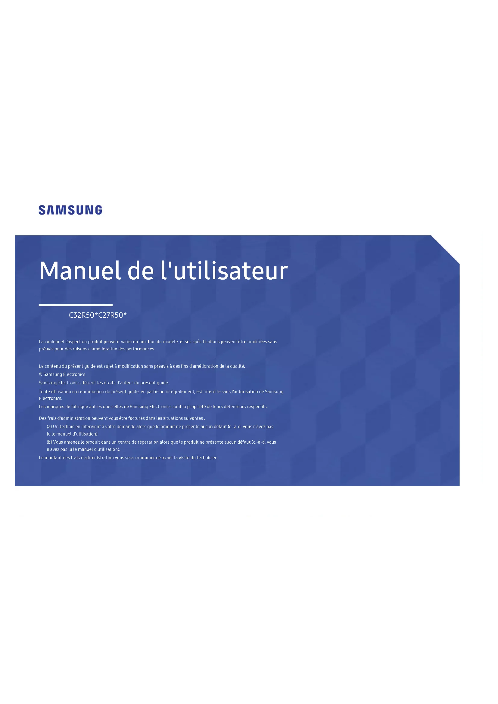 Manuel de l'utilisateur C32R50*C27R50* La couleur et l'aspect du produit peuvent varier en fonction du modèle, et ses spécifications peuvent être modifiées sans préavis pour des raisons d'amélioration des performances. Le contenu du présent guide est sujet à modification sans préavis à des fins d'amélioration de la qualité. © Samsung Electronics Samsung Electronics détient les droits d'auteur du présent guide. Toute utilisation ou reproduction du présent guide, en partie ou intégralement, est interdite sans l'autorisation de Samsung Electronics. Les marques de fabrique autres que celles de Samsung Electronics sont la propriété de leurs détenteurs respectifs. Des frais d'administration peuvent vous être facturés dans les situations suivantes: (a) Un technicien intervient à votre demande alors que le produit ne présente aucun défaut (c.-à-d. vous n'avez pas lu le manuel d'utilisation). (b) Vous amenez le produit dans un centre de réparation alors que le produit ne présente aucun défaut (c.-à-d. vous n'avez pas lu le manuel d'utilisation). Le montant des frais d'administration vous sera communiqué avant la visite du technicien.2 Table des matières Avant utilisation du produit 4Sécurisation de l'espace d'installation Précautions de stockage 4