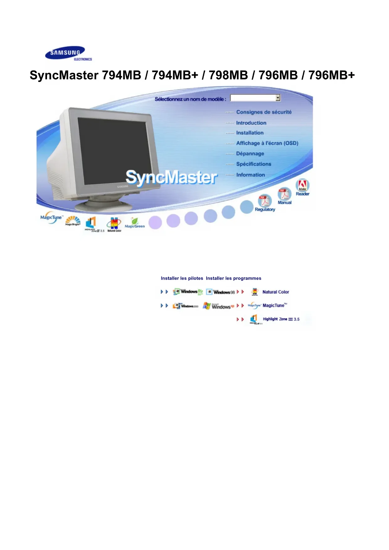 Installer les pilotes Installer les programmes SyncMaster 794MB / 794MB+ / 798MB / 796MB / 796MB+Notational Ne pas suivre les consignes marquées par ce symbole pourrait avoir comme conséquence des blessures corporelles ou des dommages sur le matériel. Intérdit Important a lire et a comprendre dans toutes circonstances. Ne pas démonter Déconnecter la prise de la sortie du courant. Ne pas toucher. Mettez dans un endroit stable pour empêcher une décharge électrique. Alimentation Si l'appareil n'est pas utilisé pendant de longs laps de temps, installez un économiseur d’écran. z Si la même image est présente longtemps à l’écran, des brûlures des phosphores peuvent se produire ou l’écran peut se brouiller. SyncMaster 794MB / 794MB+ / 796MB / 796MB+Ne pas utiliser une prise endommagée ou desserrée. z Ceci peut causer une décharge électrique ou un incendie. Ne pas débrancher une prise en la tirant par son cordon. z Ceci peut causer une décharge électrique ou un incendie. Utiliser uniquement des prises correctement reliées à la terre.