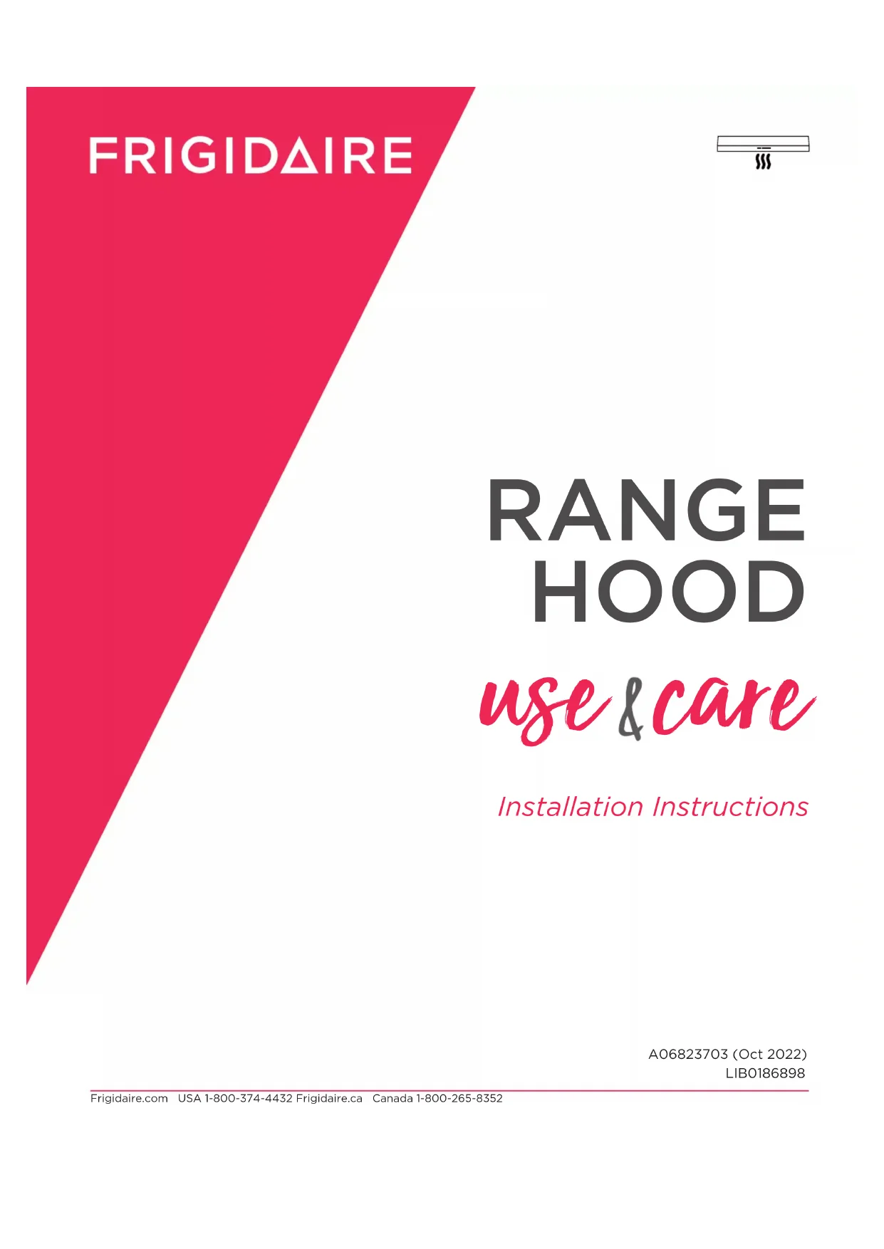 INTRODUCTION Bienvenue dans notre famille Nous vous remercions d’avoir choisi Frigidaire pour habiter chez vous ! Nous considérons votre achat comme le début d’une longue relation. Ce manuel est votre ressource pour l’utilisation et l’entretien de votre produit. Veuillez le lire avant d’utiliser votre appareil. Gardez-le à portée de main pour pouvoir vous y référer rapidement. Si quelque chose ne va pas, la section de dépannage vous aidera à résoudre les problèmes les plus courants.FAQ, conseils utiles et vidéos, produits de nettoyage et accessoires pour la cuisine et la maison sont disponibles à l’adresse suivante www.frigidaire.com.We est là pour vous ! Visitez notre site web, discutez avec un agent ou appelez- nous si vous avez besoin d’aide. Nous pouvons peut-être vous aider à éviter une visite d’entretien. Si vous avez besoin d’un service après-vente, nous pouvons le mettre en place pour vous. Conservez les informations relatives à votre produit ici afin de pouvoir les retrouver facilement. Numéro de modèle: Numéro de série: Date d’achat: Rendons-le ociel ! N’oubliez pas d’enregistrer votre produit. Visitez le site Frigidaire.com/register Ou utilisez votre appareil mobile pour scanner le code QR. Lisez toutes les consignes de sécurité figurant au début du manuel d’utilisation et d’entretien. Retirez tous les matériaux d’emballage de votre hotte avant de l’utiliser. Vérifiez que l’appareil est sous tension. Testez la commande de la hotte pour vous assurer qu’elle fonctionne correctement (page 36). N’oubliez pas d’enregistrer votre produit ! Liste de contrôle pour l’installation Introduction 20 Consignes de sécurité importantes 21 Liste des matériaux 26 Exigences en matière d’emplacement 26 Dimensions du produit 27 Exigences concernant l’evacuation 27 Préparation de l’emplacement 29 Installation de la hotte (version ventilée) 31 Installation de la hotte (version recirculant) 33 Utilisation de la hotte 34 Entretien de la hotte 35 Dépannage 36 Garantie 37 Retirer les filtres à graisse La plaque de série se trouve sur le côté gauche de la hotte.conSIGneS de SécurIté ImportanteS