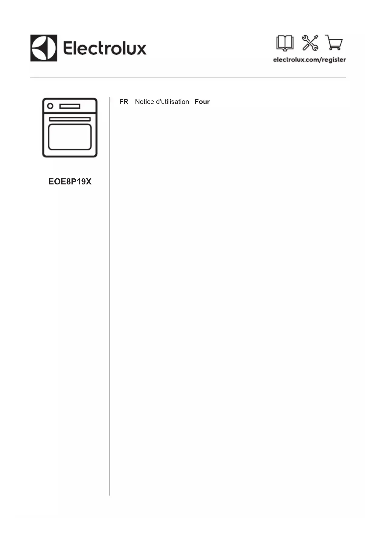 FR Notice d'utilisation | FourBienvenue chez Electrolux ! Nous vous remercions d’avoir choisi l’un de nos appareils. Dans un souci de durabilité, nous réduisons les supports papier et proposons lesmanuels d’utilisation complets en ligne. Accédez à votre manuel d’utilisation completsur electrolux.com/manualsObtenir des conseils d’utilisation, des brochures, un dépanneur, des informations surle service et les réparations sur electrolux.com/supportPour plus de recettes, conseils, informations de dépannage, téléchargez l’application My Electrolux Kitchen.Sous réserve de modifications.
