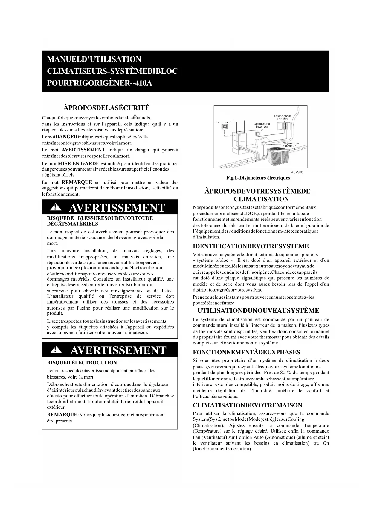AVERTISSEMENT RISQUE D’ÉLECTROCUTIONLe non--respect de cet avertissement pourrait entraîner desblessures, voire la mort.Débranchez toute alimentation électrique dans le régulateurd’air intérieur ou la chaudière avant de retirer des panneaux d’accès pour effectuer toute opération d’entretien. Débranchez le cordon d’alimentation du module intérieur et de l’appareilextérieur .REMARQUE : Notez que plusieurs disjoncteurs pourraientêtre présents.A07903Disjoncteur principalDisjoncteur intérieurDisjoncteur extérieurThermostatFig. 1 – Disjoncteurs électriques